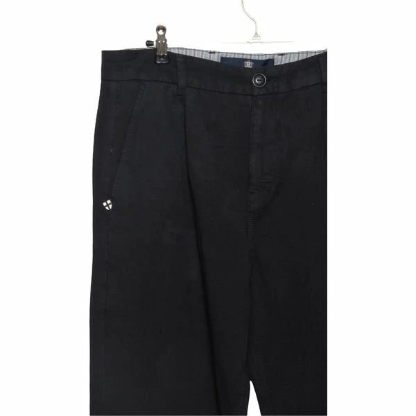 The Bravúomo chino has a uniquely relaxed fit with roomy leg tapering at the hem. Single-facing front pleats, zipper closure and four pockets. The cotton/ linen fabric has a nice structure and is perfect for warm summer days.▹ Relaxed fit ▹ Cotton/ linen twill ▹ Corozo logo buttons ▹ Zipper fly ▹ Blue de Genes flag rivet. ▹ Contrast lining ▹ Made in Turkey item no.: 4220125052 999 black