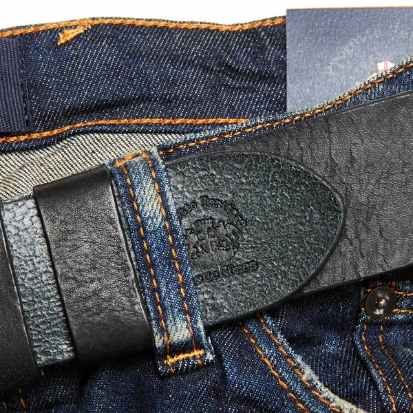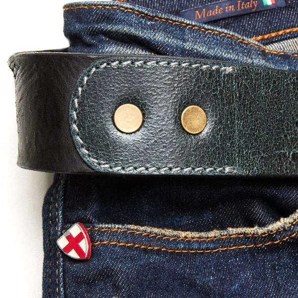 Crafted from cow leather and given a special treatment for a vintage look. The cracking of the surface is a normal process of this treatment and adds to a refined look. 100% Leather width of the belt 4 cm thickness of the belt 3 mm Logo embossed Hand painted flag rivet Made in the EU