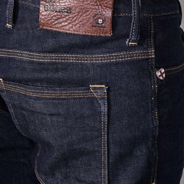 Repi is the regular slim fit jean from Blue de Genes. A classic five-pocket jean with button closure and asymmetrical back pockets that are lined for longer durability. Featured with repair-details at the coin-pocket and back belt loop, pocket print, branded buttons, hidden rivets and the Blue de Gênes flag rivet subtly placed at the right front pocket. 99% Cotton / 1% Elastane Comfort stretch denim Dark blue wash Five-pocket jean Slim fit tapered leg Blue de Gênes flag rivet Double-lined back pockets Repair detail at coin pocket Button fly Made in Italy