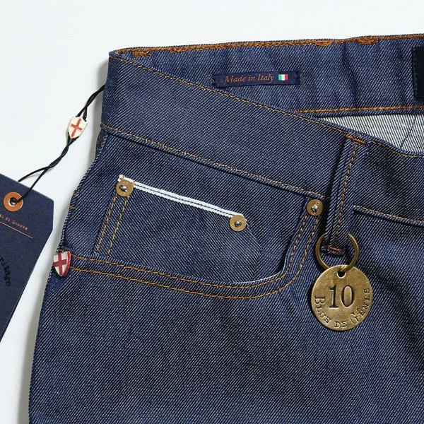 Features: This year we are celebrating our ten years ofmaking jeans with an anniversary edition of ourpopular Vinci model. Crafted from a 12,5 ounceright hand blue selvedge from Koruki in Japan.Dipped in natural indigo this jean features rededge dyed leather patch, selvedge detail at coinpocket and beltloop, open rivets, Italian flagembroidery at left front pocket, flag pin at rightfront pocket and anniversary pocket print. Limited to 140 pairs Vinci offers a regular fit with a slightlytapered silhouette. This five-pocket jean featuresparallel double-lined back pockets, button fly,printed pocket lining, Italian flag embroidery atleft front pocket and stitchdetails. Regular fit Limited edition Five-pocket jean Dry selvedge Button fly Blue de Gênes flag rivet at coin pocket Italian flag embroidery on pocket mirror Double lined back pockets Contrast stitching Made in Italy Composition: Cotton 100%