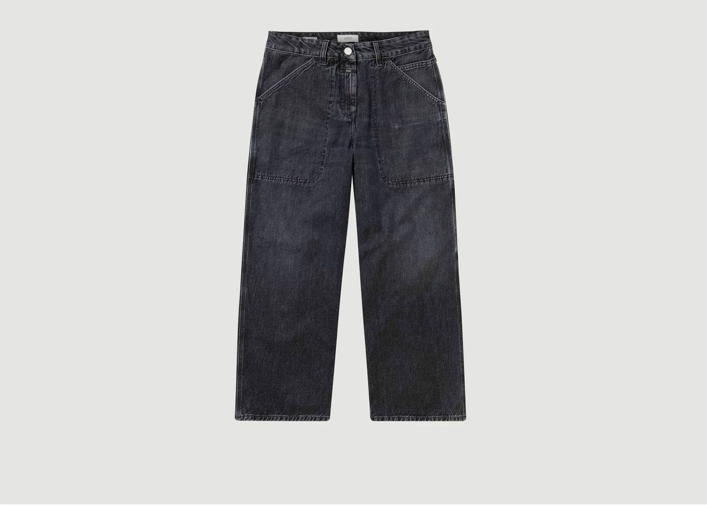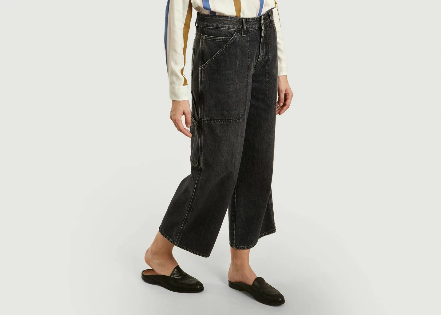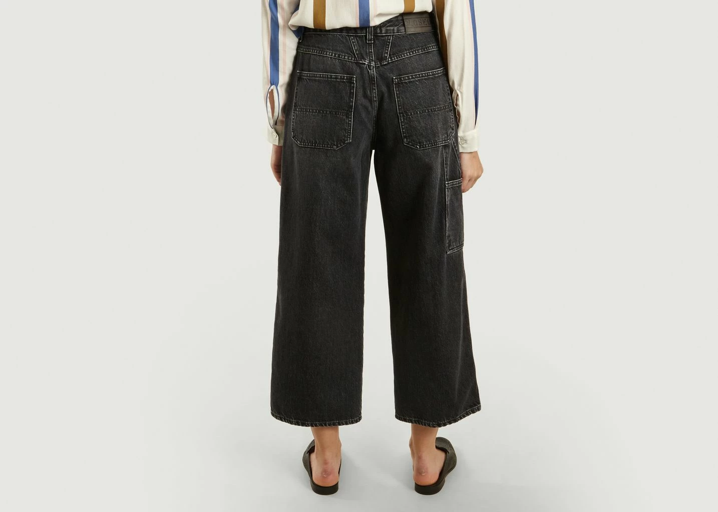 Black tinted and faded jeans in historic denim 13 oz 100% cotton, wide cut, ankle length, concealed zip fastening with metal button, belt loops, 2 large front pockets, 2 patch pockets behind, leather logo patch on the back. These jeans size large.