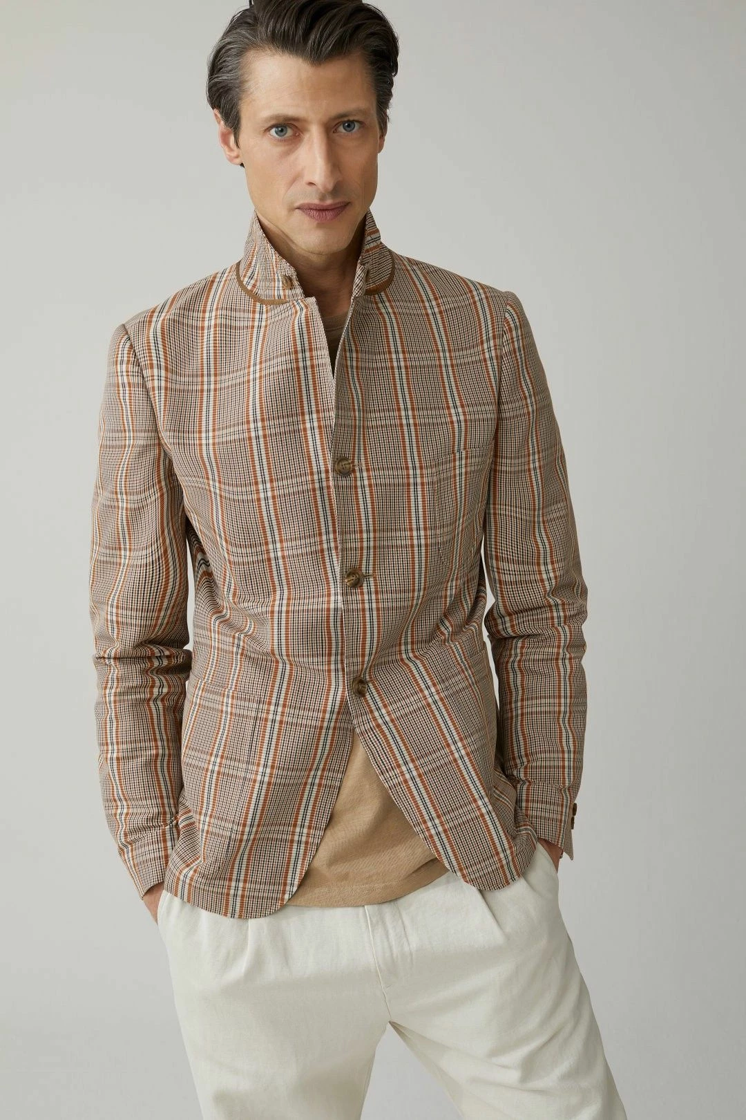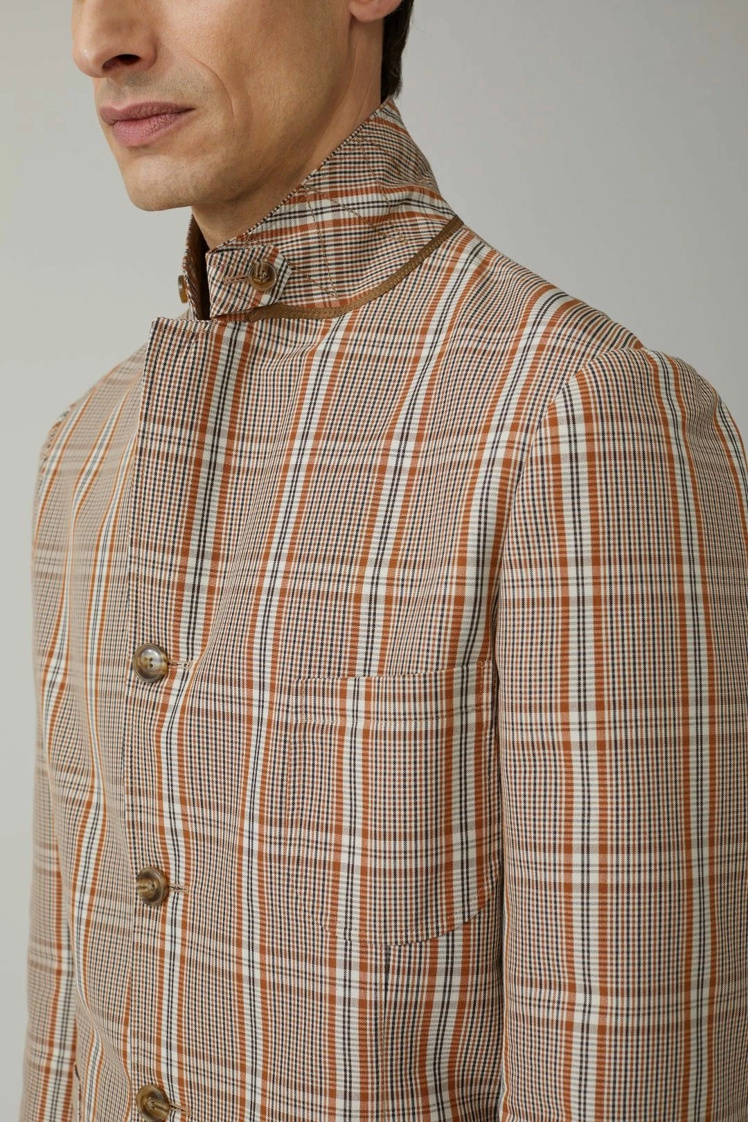 Il est en mélange coton de fils italien avec un motif jacquard à carreaux. Il a un bouton et une bride au col permettant de le fermer, avec un fin passepoil au dessous du col.