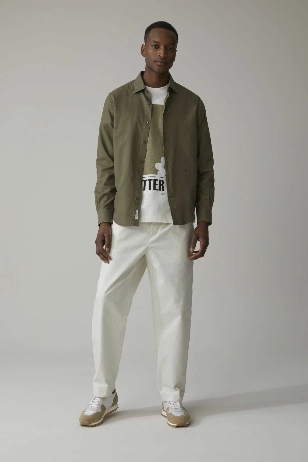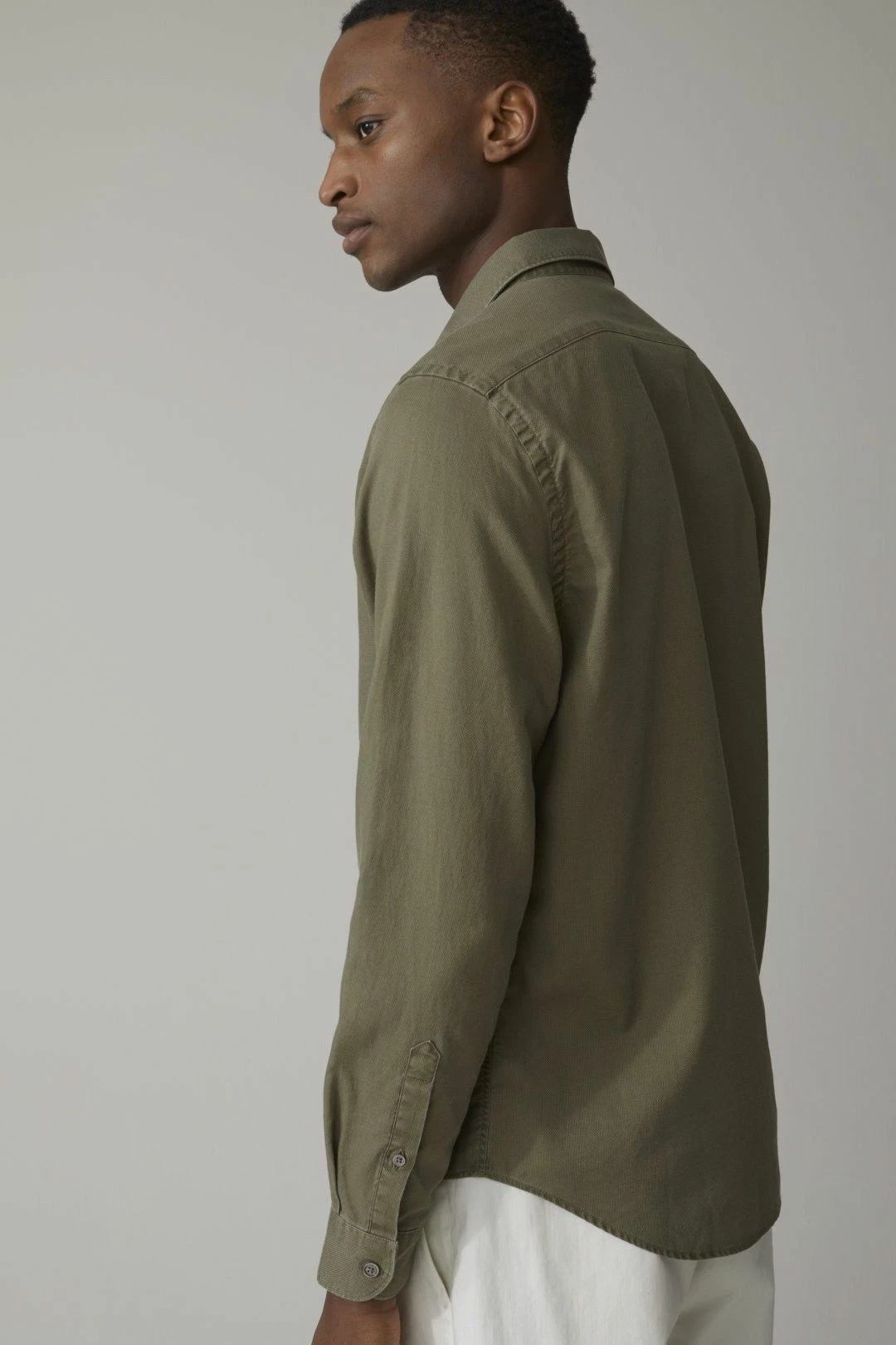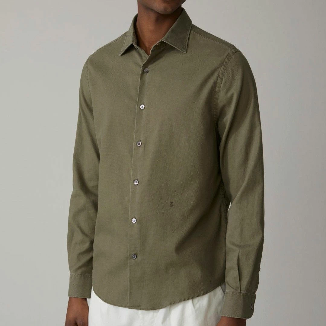 La chemise de Closed avec col souple à pointes écartées, en piqué de pur coton, avec une teinte kaki légèrement optique délavée.