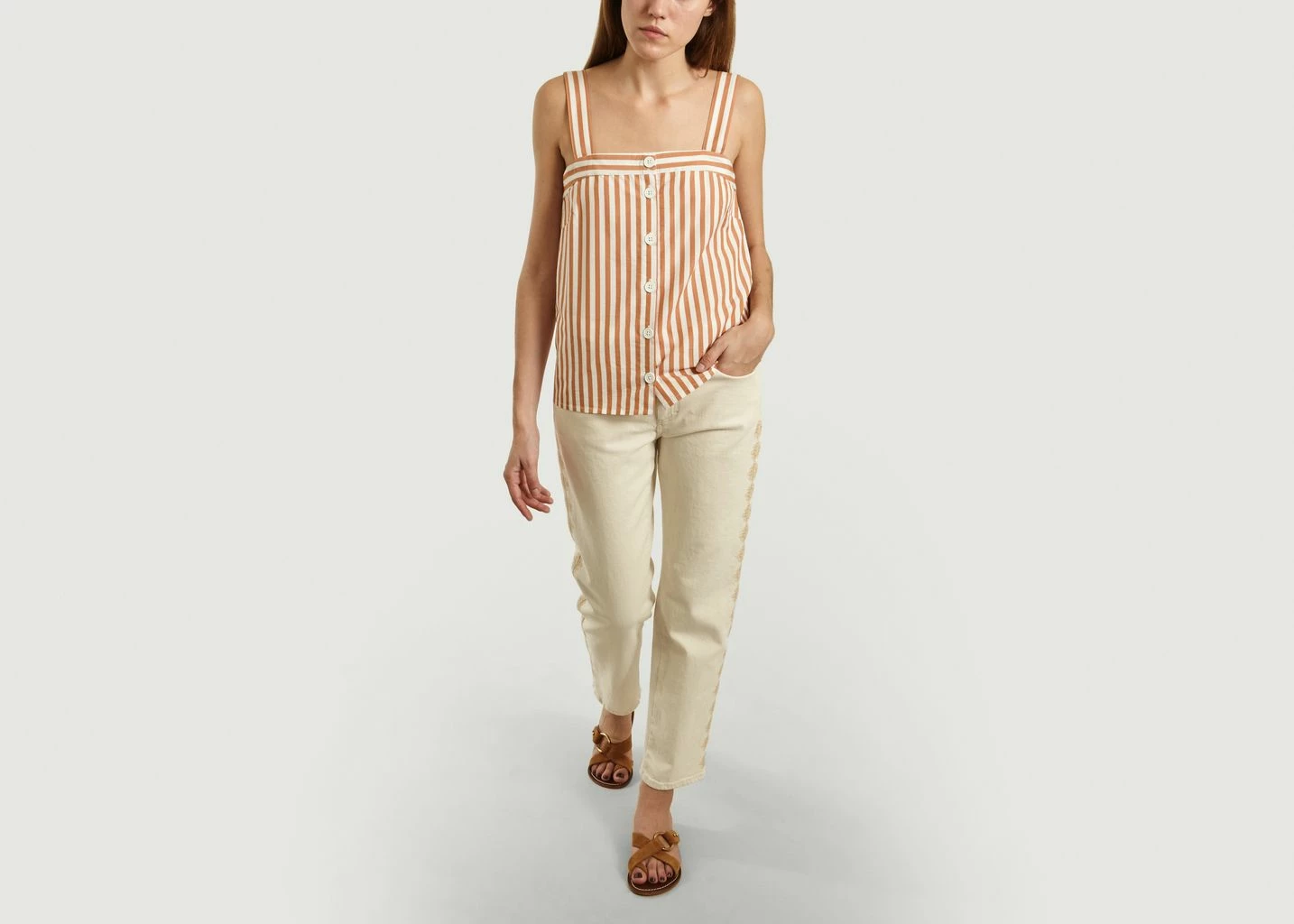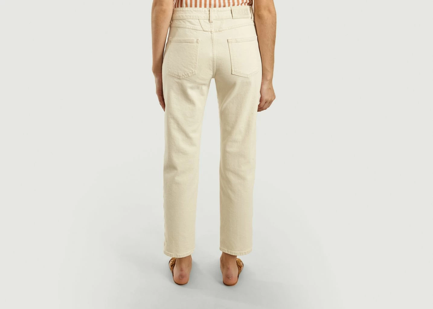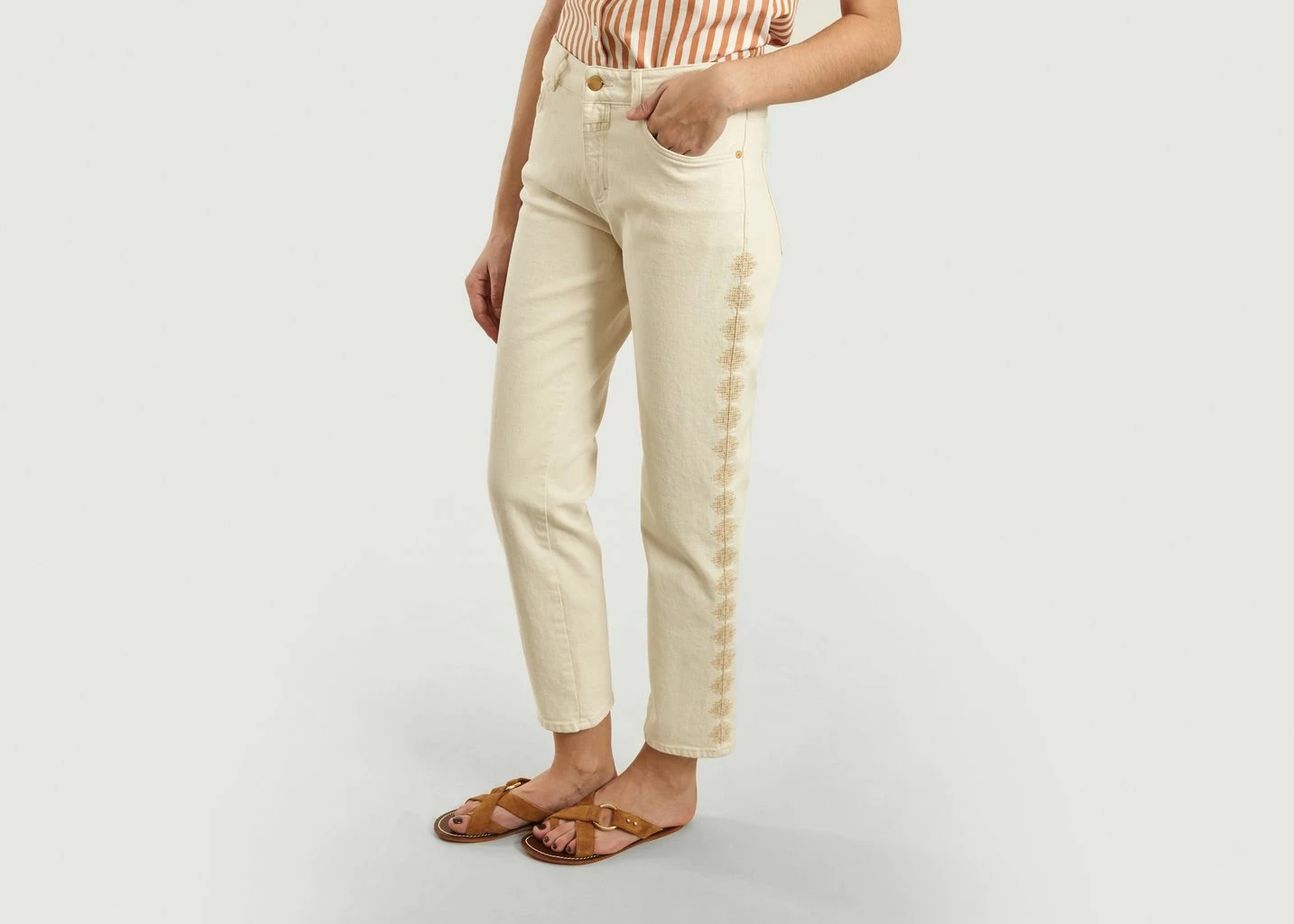 Cream-colored jeans made of heritage denim 12 oz of stretch cotton, relaxed cut at the top and straighter at the bottom of the leg, ankle length, beige fancy embroidery along the legs, concealed zip fastening enhanced with a metal button, belt loops, 5 classic pockets, tone on tone logo leather patch on the back.