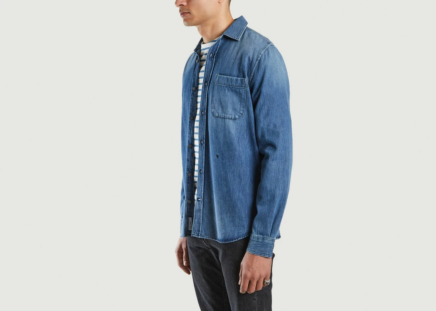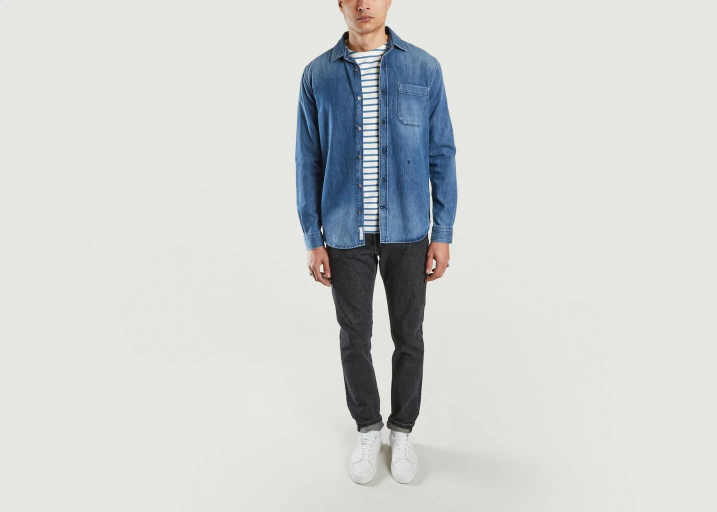 Denim shirt, made of cotton and recycled cotton. Featuring a regular fit, faded look, chest pocket, mother-of-pearl buttons, embroidered logo, rounded hem and covered label “Not Just A Standard Shirt” at the bottom of the button placket. We love this basic piece of the men’s wardrobe, light and soft! Pair it with straight cut chino pants and a pair of sneakers.