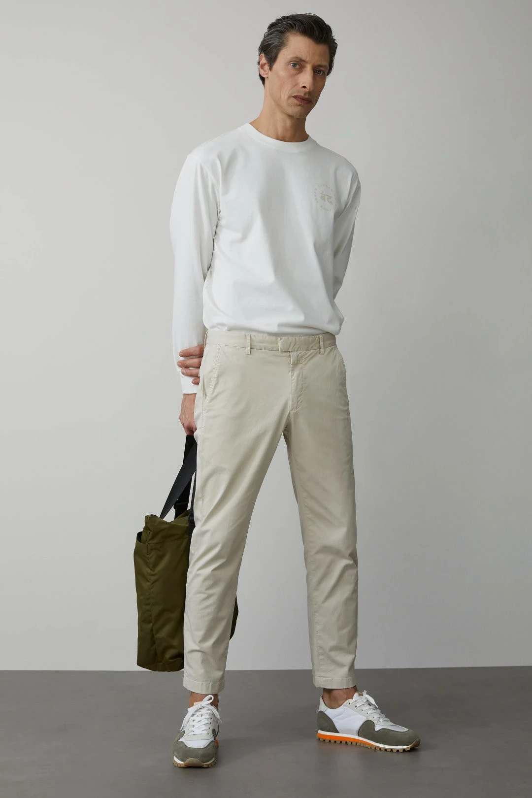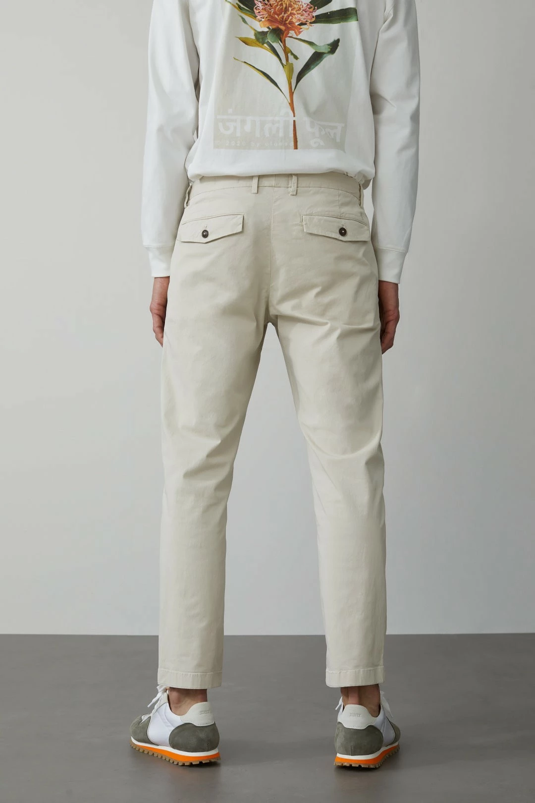 Ce chino est en twill de coton avec très fine structure et élasthanne, une fermeture en crochet et bouton à la taille, des French Pockets, Fly Label, et poches à rabat boutonnées et broderie C- derrière.