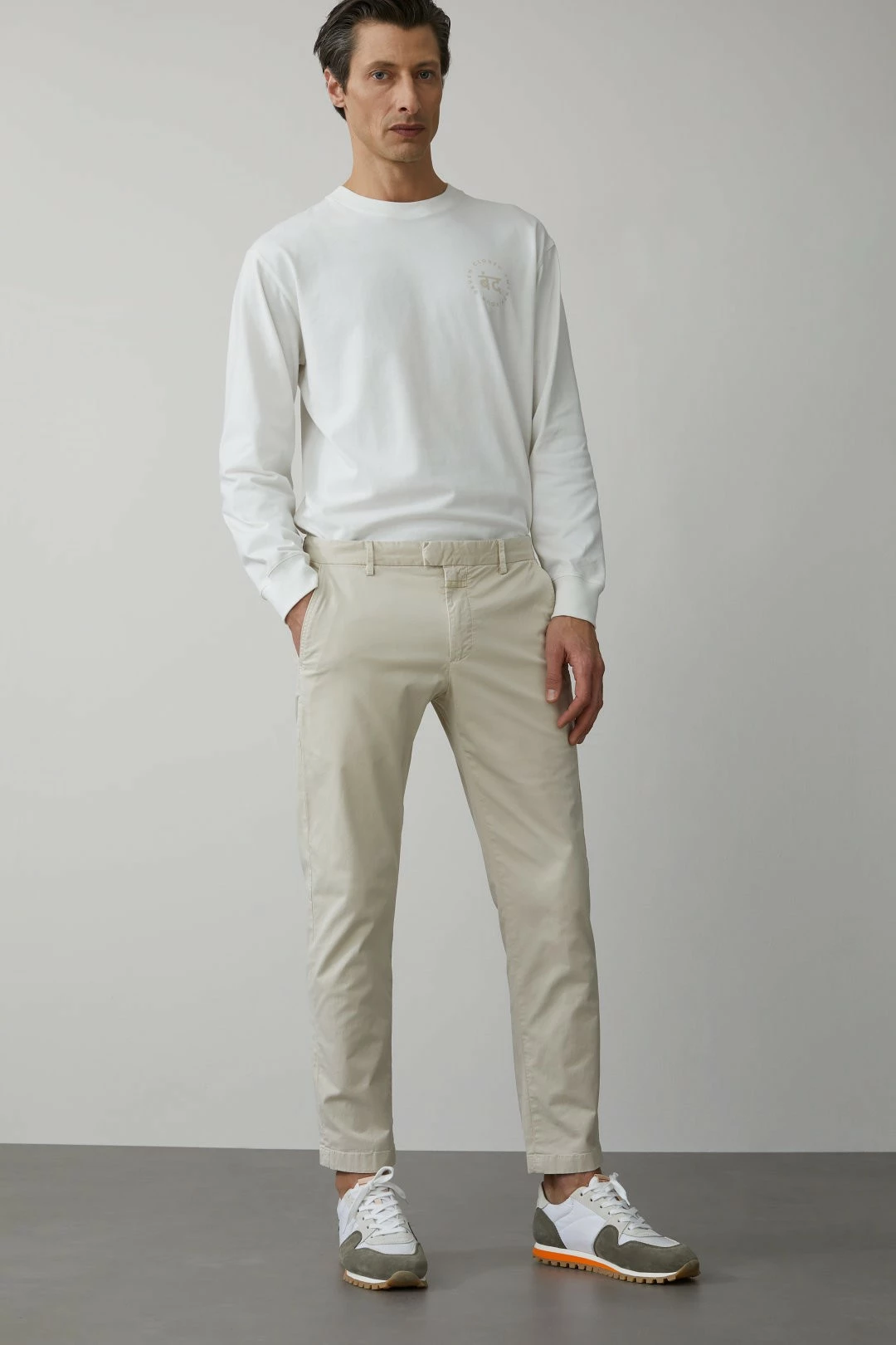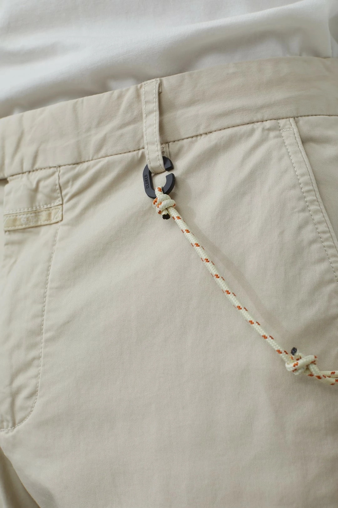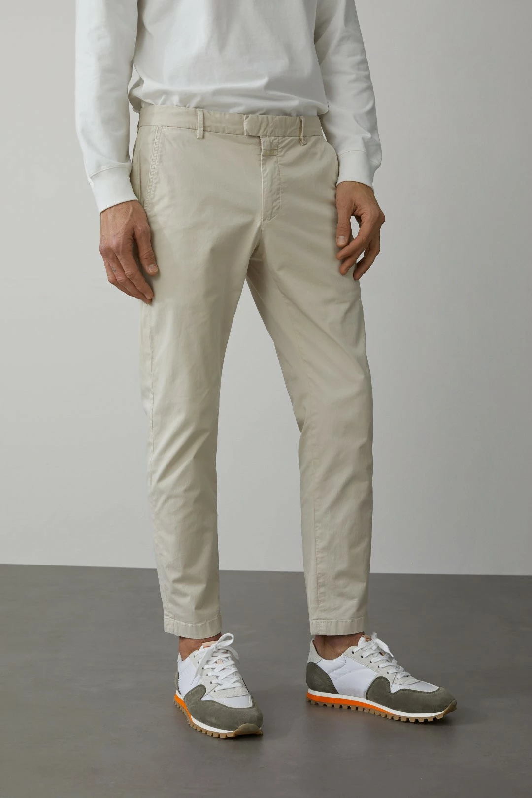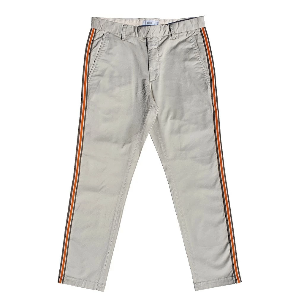 Une très belle pièce de la nouvelle Collection Printemps-Été de Closed : leur Devon Chino, ici en version beige avec rayures oranges sur les coutures (le modèle porte la version sans rayures, mais nous vendons la version avec, comme sur la première photo. Les photos suivantes, avec mannequin, vous sont présentés à titre indicatif pour donner un aperçu de la coupe générale du pantalon).