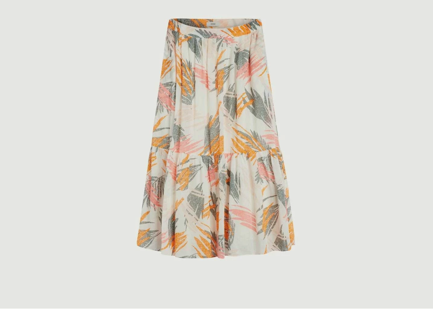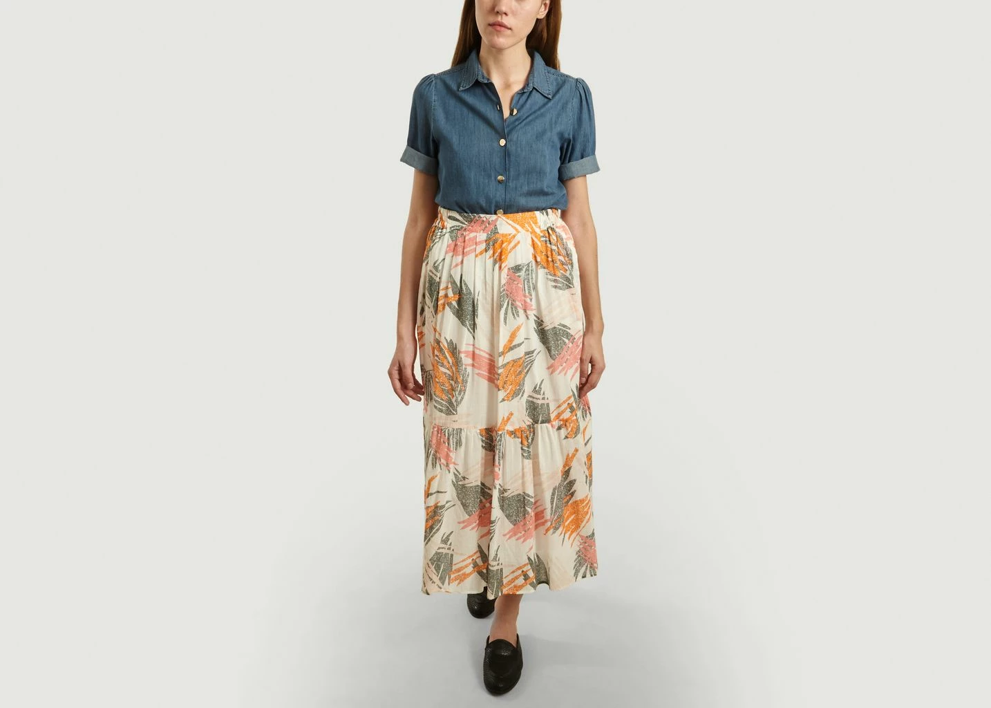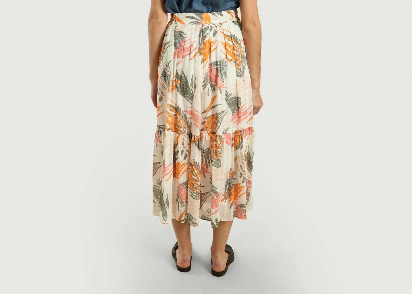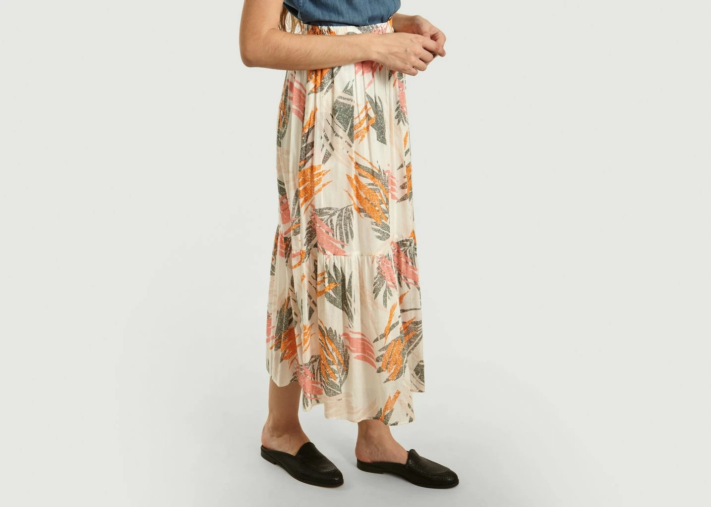 Leaf long skirt made of cotton and lined with viscose in an ecru color with leaf print. It has a flared cut with a gradient pattern, an elasticated waistband with a pleated effect, side pockets, a soft drop and tone-on-tone finishes.