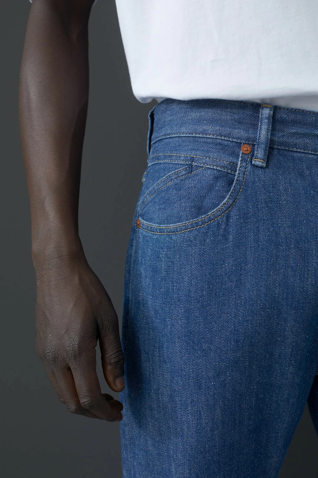 Jean 5-Pocket-Jeans Regular Fit en Selvedge Denim robuste de 13 oz. avec un pourcentage de coton recyclé et un délavage foncé.
