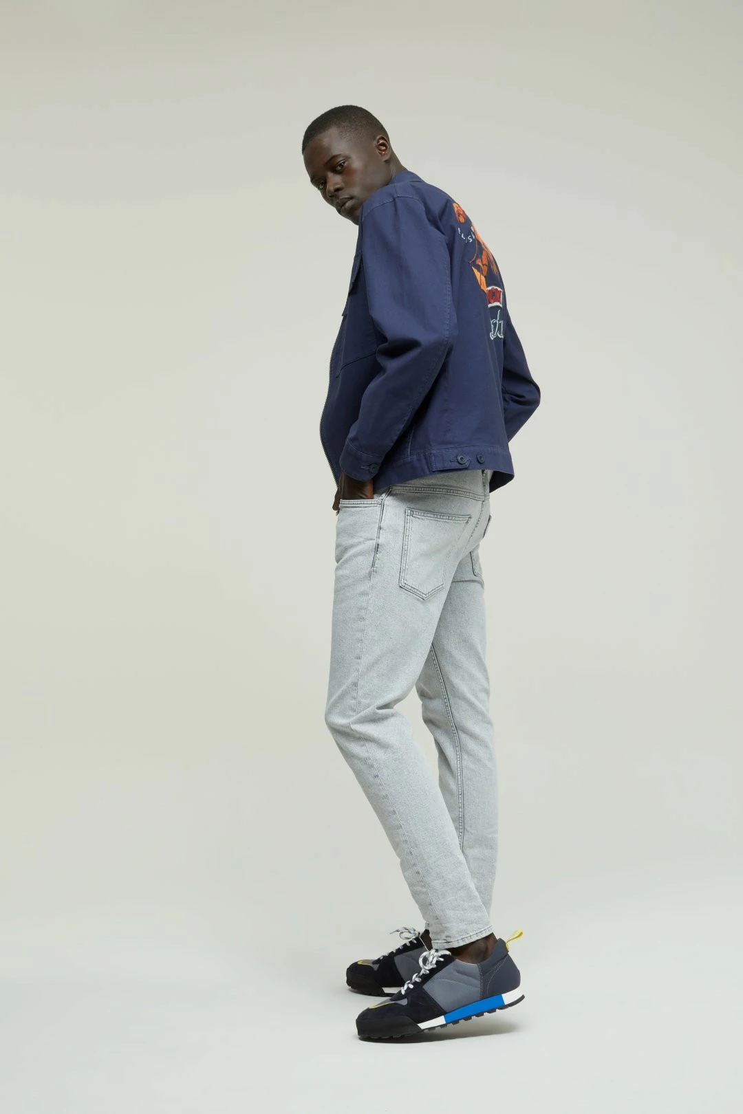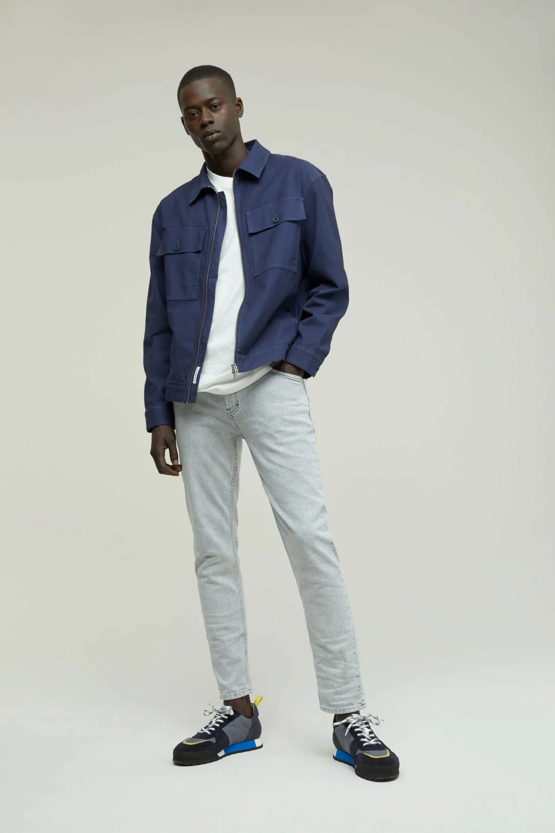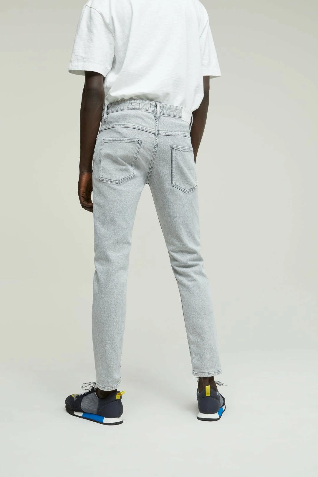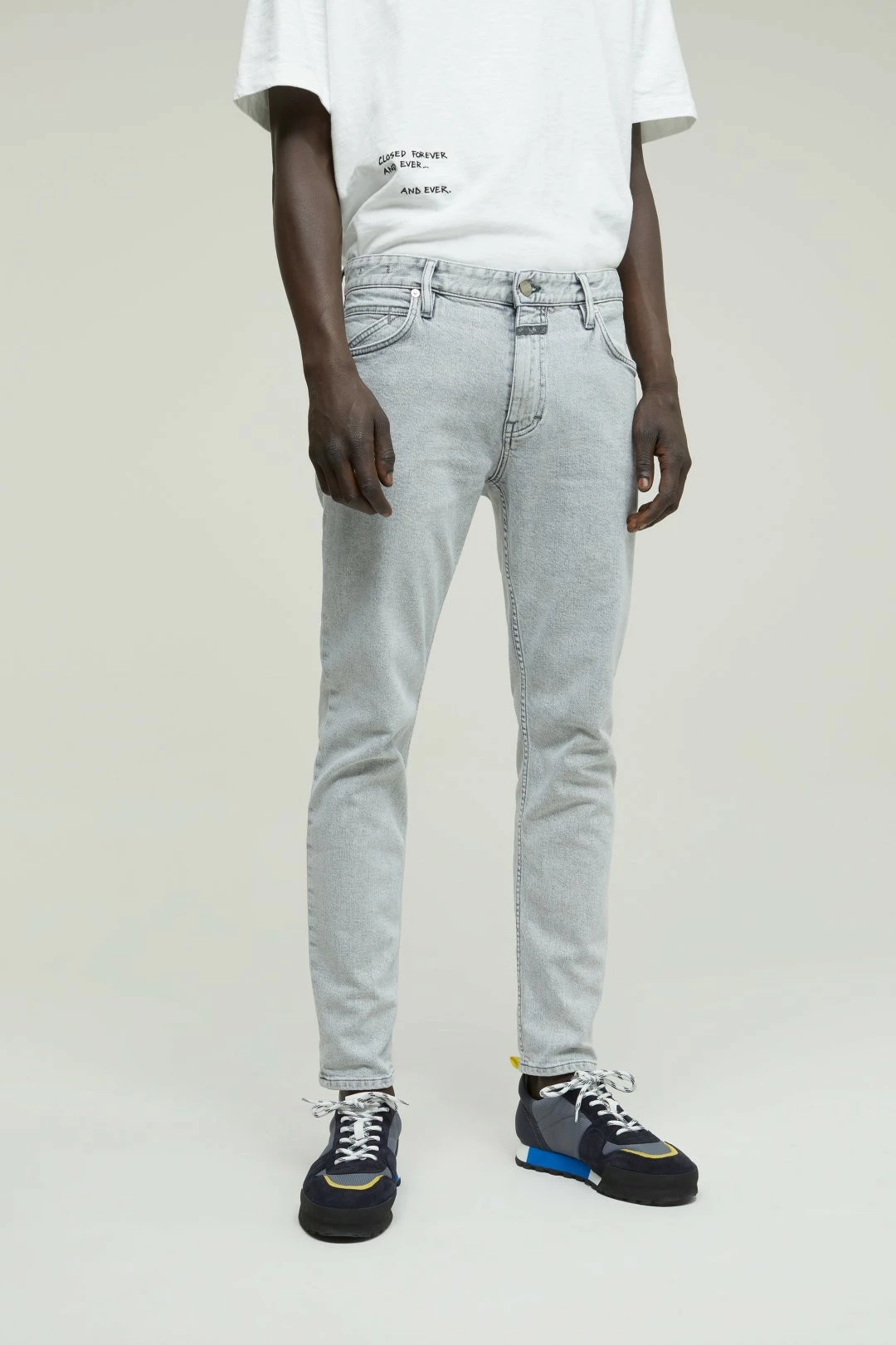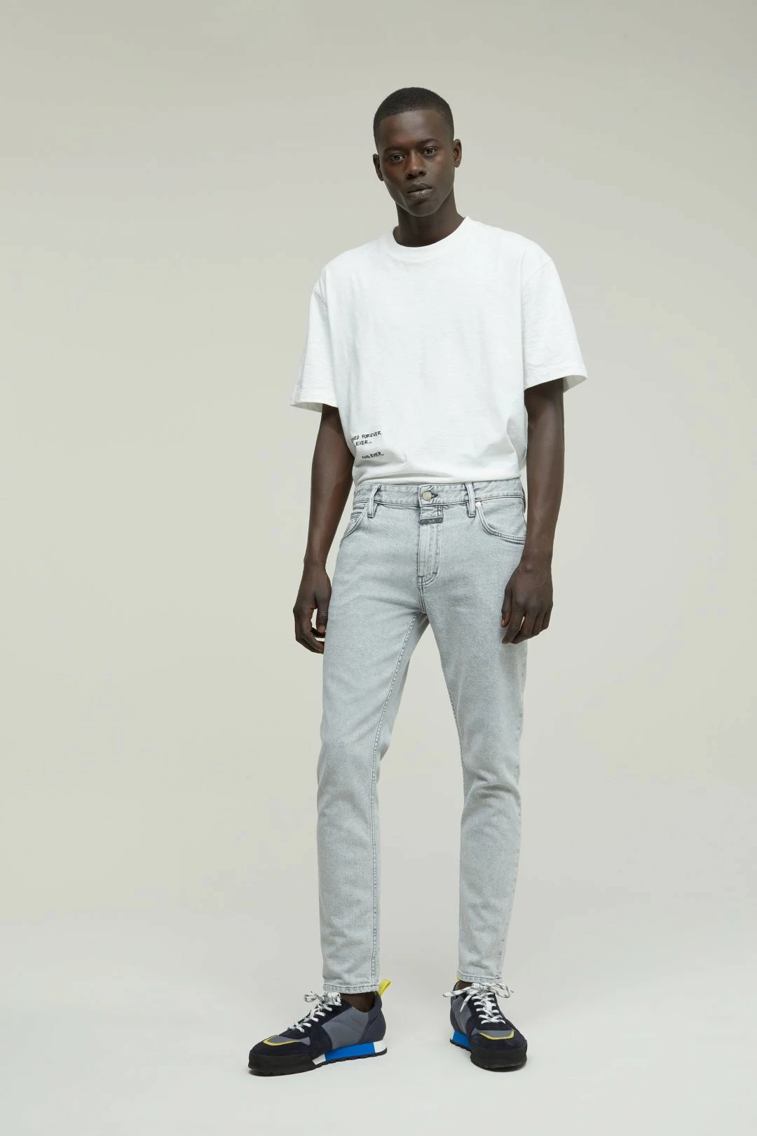 Le modèle Drop Crop de chez Closed : un jean 5 poches en Eco-denim robuste de 12oz, avec une légère élasticité grâce à l’élasthanne (2%), avec une teinte gris délavé. Il a été entièrement réalisé par la grande maison Candiani en Italie et fait parti de la ligne Denim de production durable A BETTER BLUE: il est composé de coton biologique, contient de l’élasthanne d’origine recyclée et a été traité par des méthodes de délavage et teinture respectueuses de l’environnement. Il a une coupe slim et une jambe raccourcie (tapered – longueur 30)