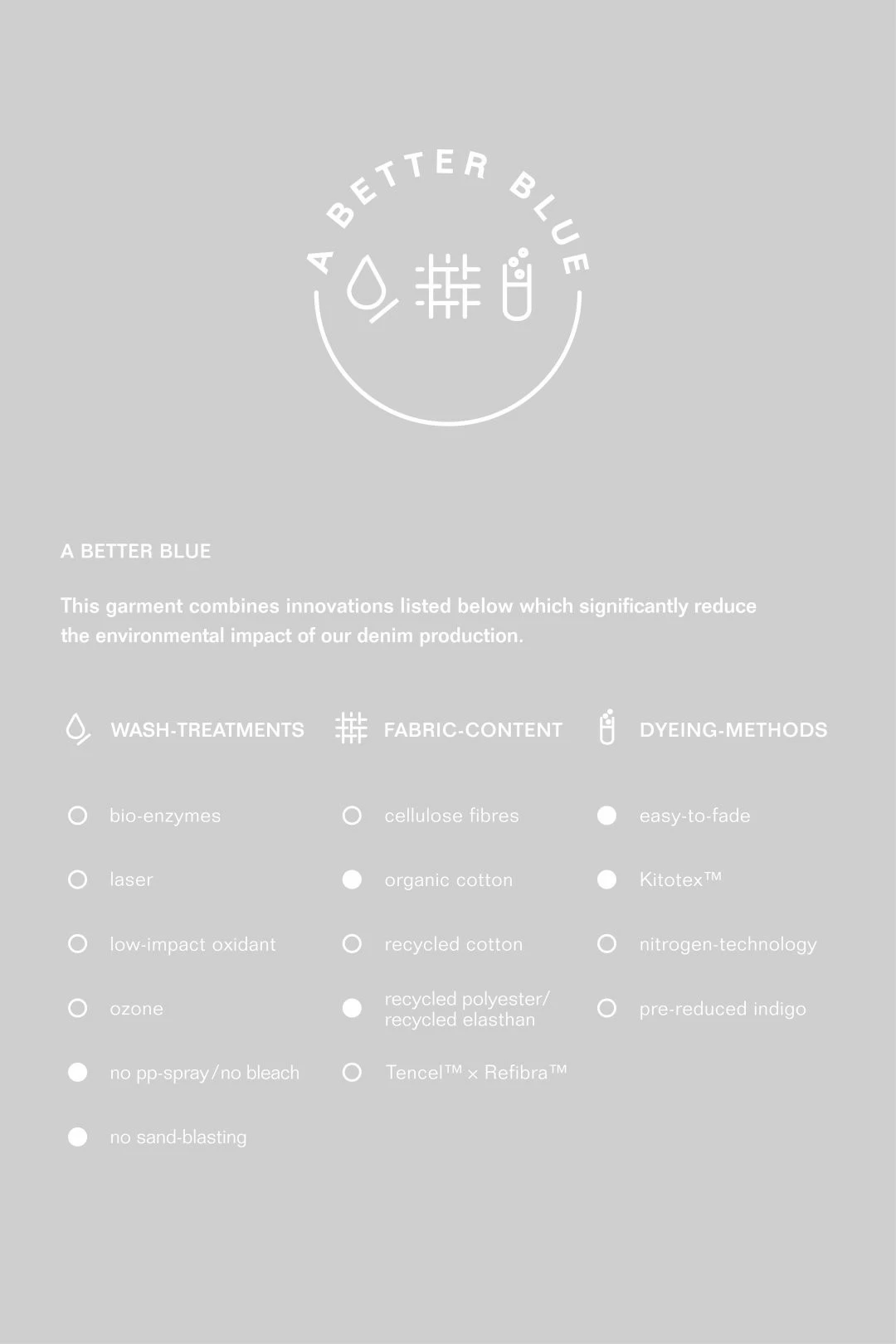 A BETTER BLUE s’engage pour la durabilité – de la première jusqu’à la dernière étape de production. En coopération avec leurs partenaires italiens, Closed utilise des matériaux durables ainsi que des méthodes de délavage et de coloration innovatives.