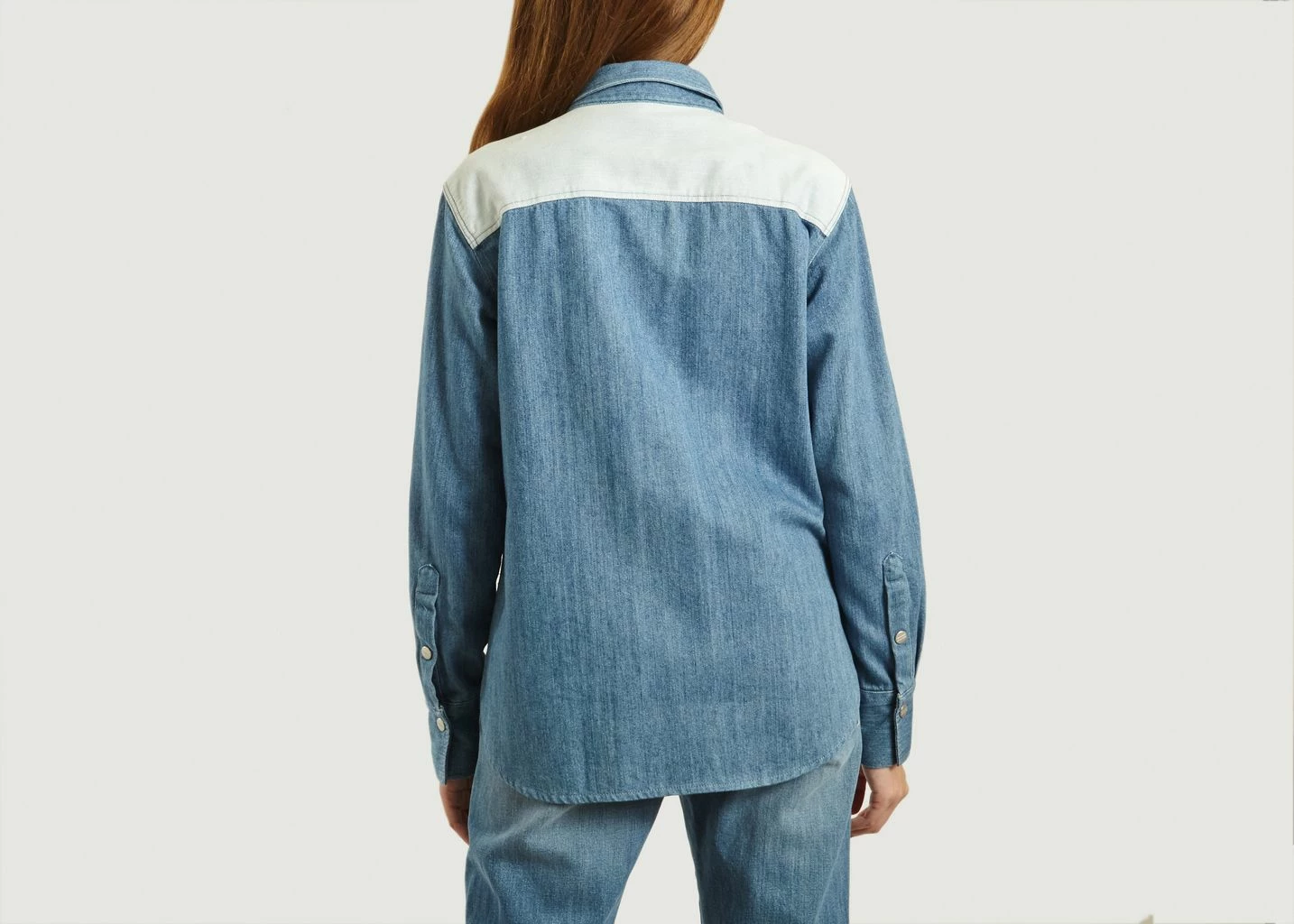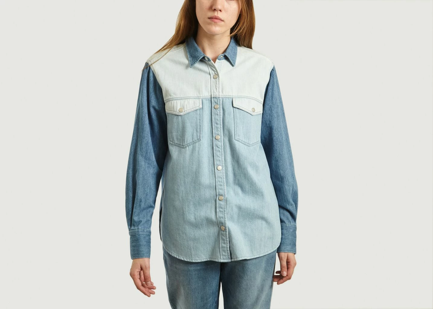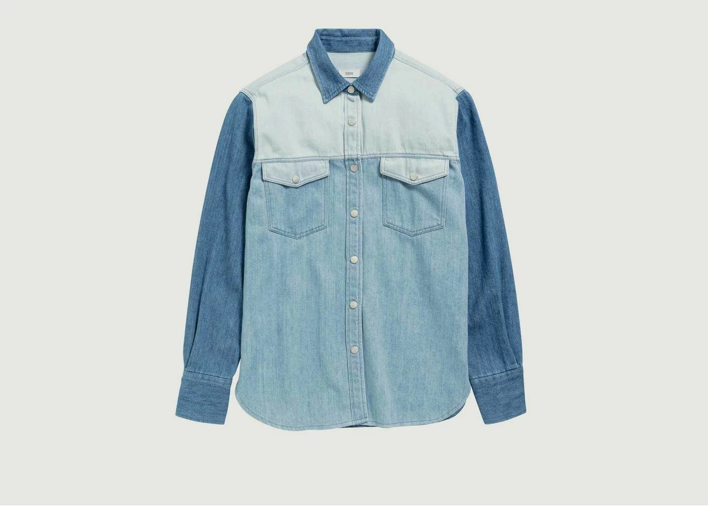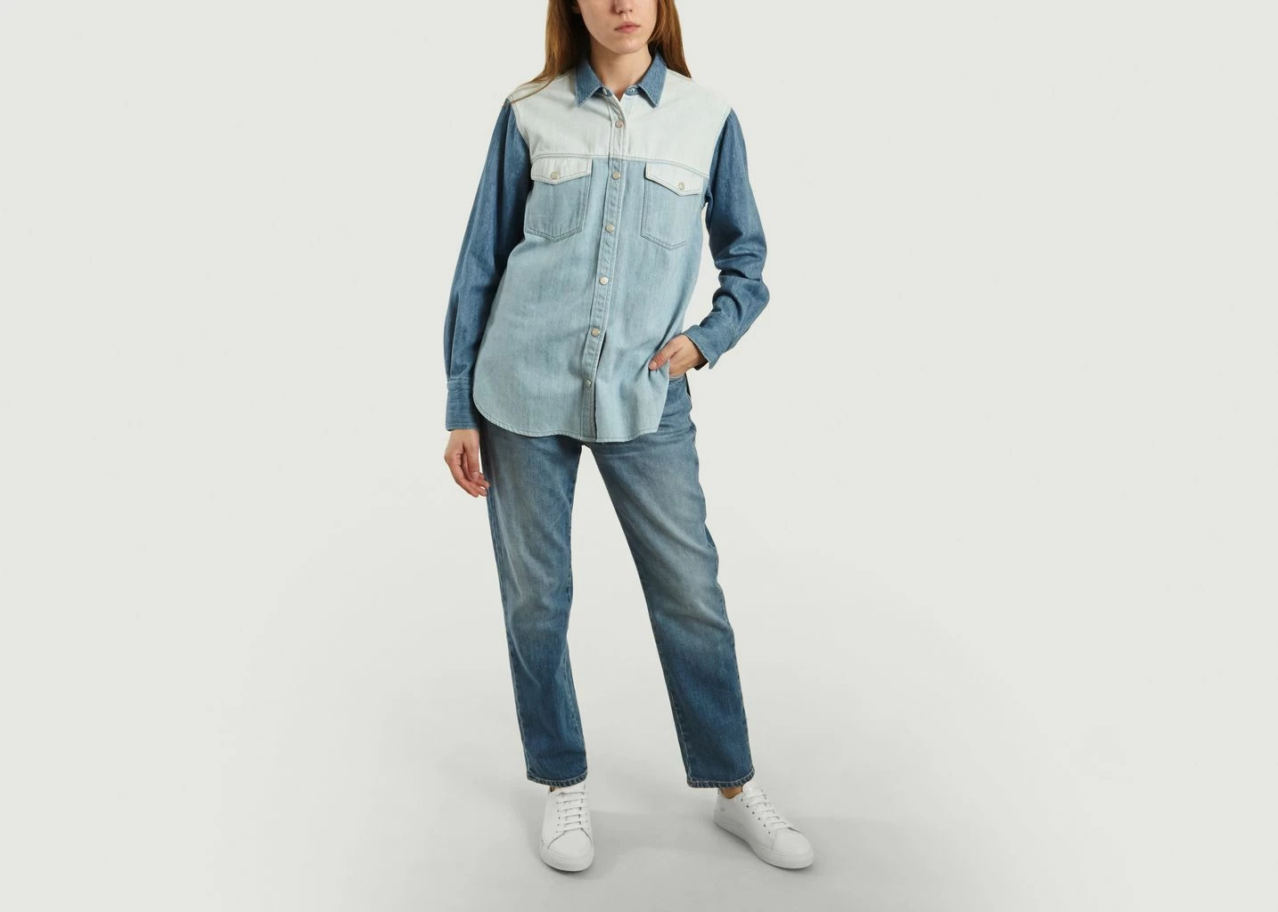 Denim 10 oz shirt 100% cotton, 3 different washes, classic, clear and very clear, comfort cut, long and rather straight, long sleeves, buttoned cuffs, classic collar, central button placket, 2 patch pockets with buttoned flap and point finish.