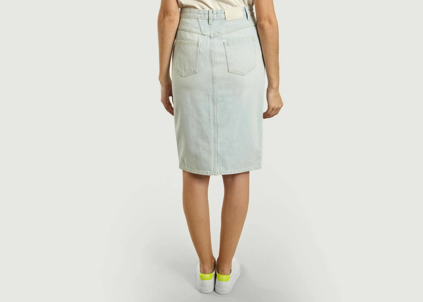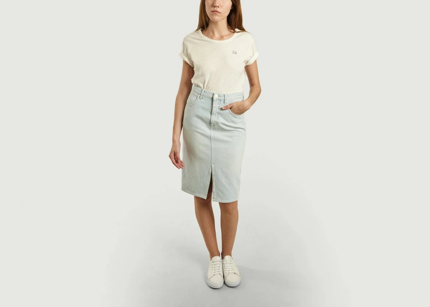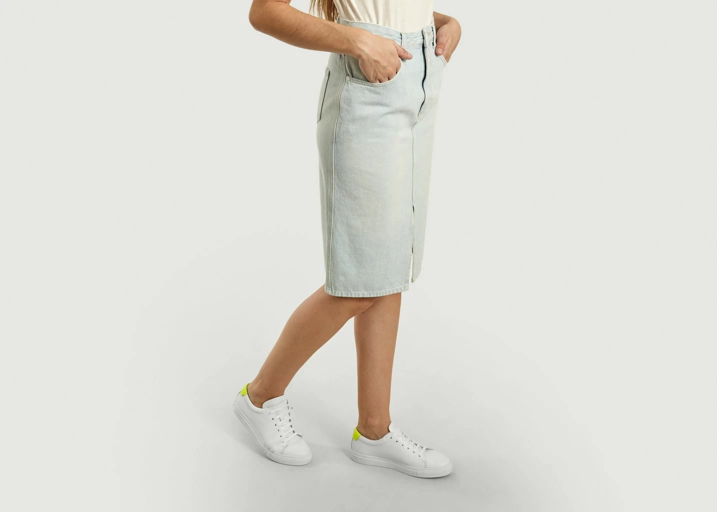 Emmet pencil skirt made of 12 oz. light blue cotton denim with uniform light washout and slight edge wear. Slim fit, it features a knee length, front slit, 5 pockets, belt loops, front button closure, leather fly label and patch, and tone-on-tone finishes.