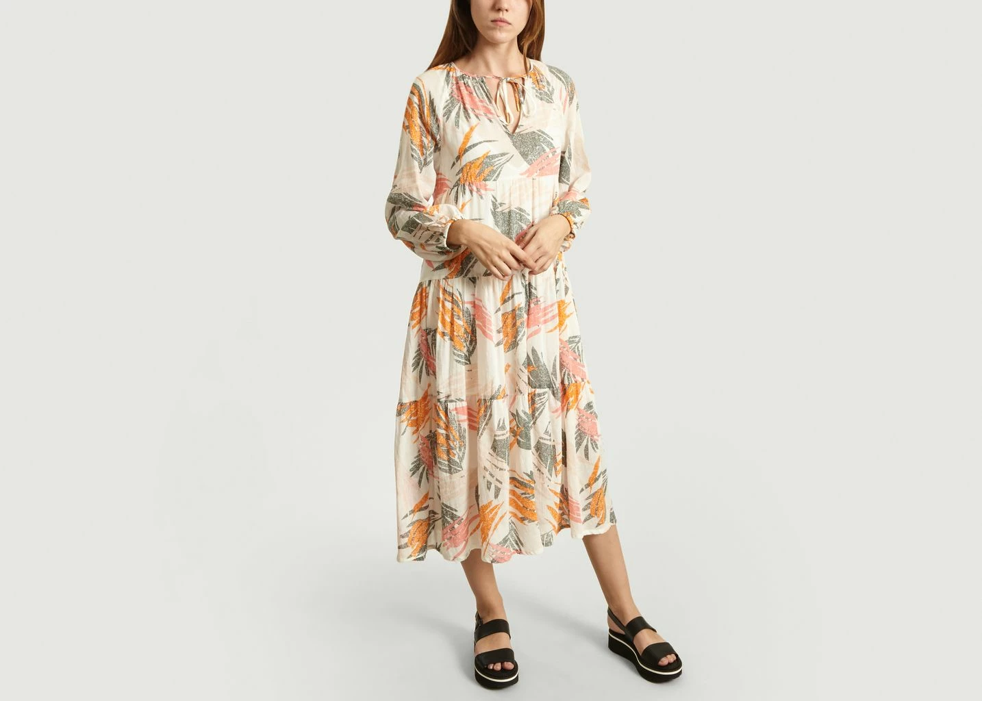 Printed dress, long sleeves tightened at the cuffs, round neckline with drawstring, fitted waist under the bust, flared cut.