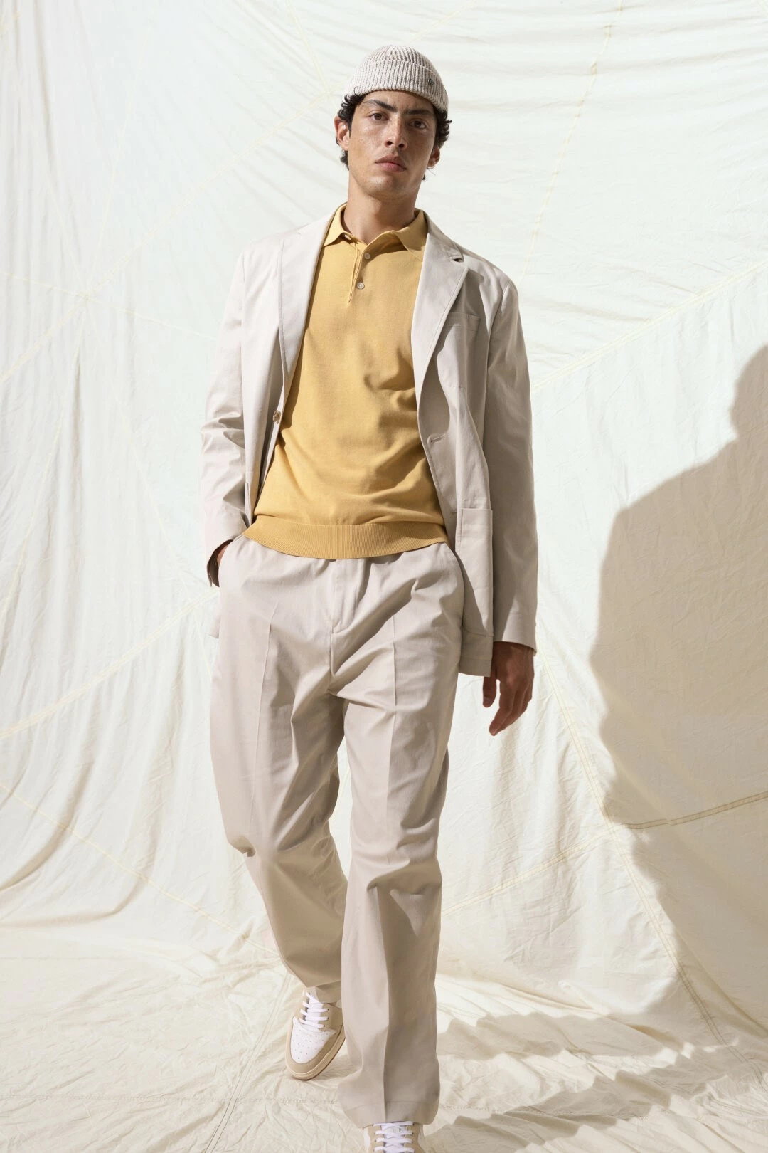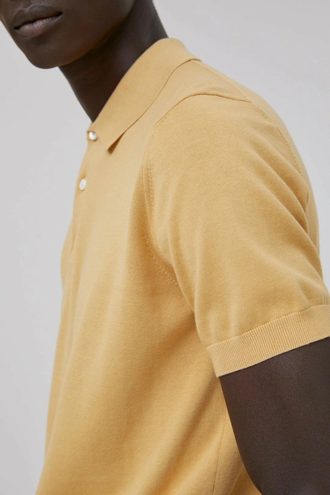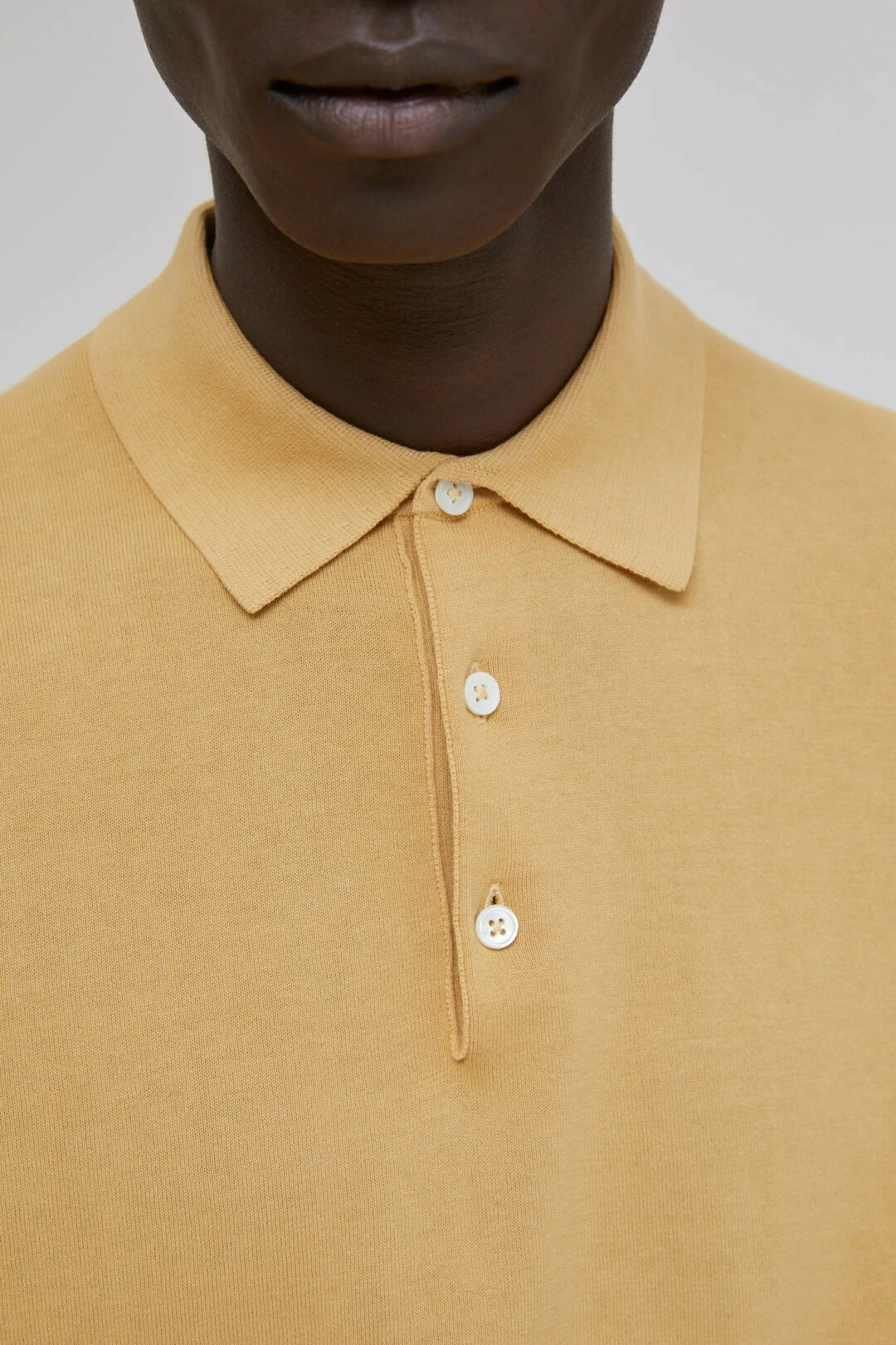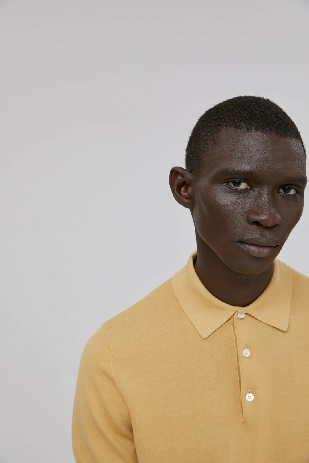 Polo en pur coton à mailles fines (16 gg) avec poignets en bord-côte, ourlet du bas en bord-côte et patte de boutonnage en nacre. Afin d’obtenir un aspect effet usé très discret, l’article fini a été teinté et lavé (Garment-Dye-Finish).