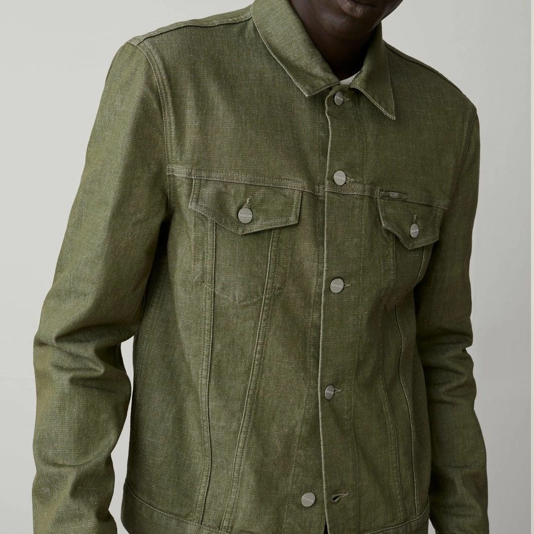 Elle est tissée en deux fils de couleurs différentes, avec des boutons à logo en métal, un fly Label et des poches-poitrine pour un coté workwear.