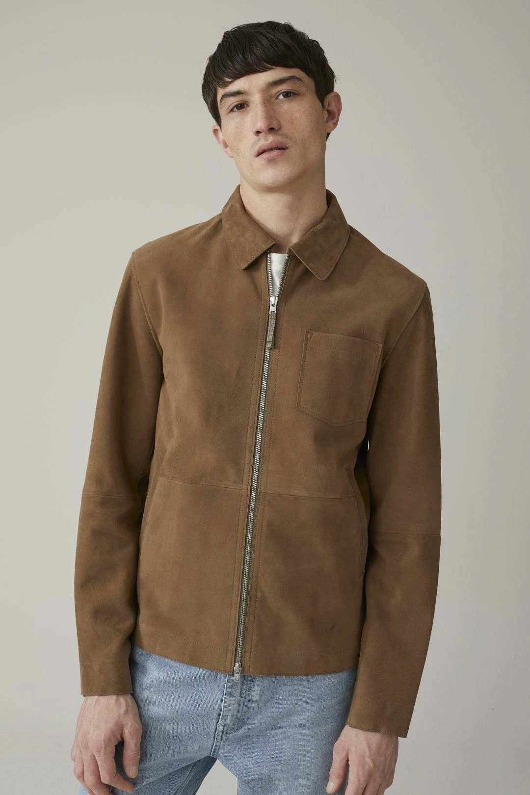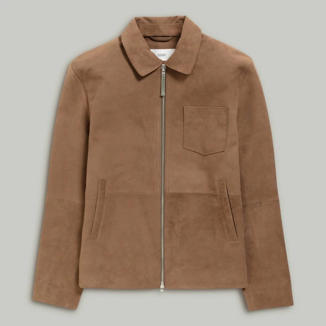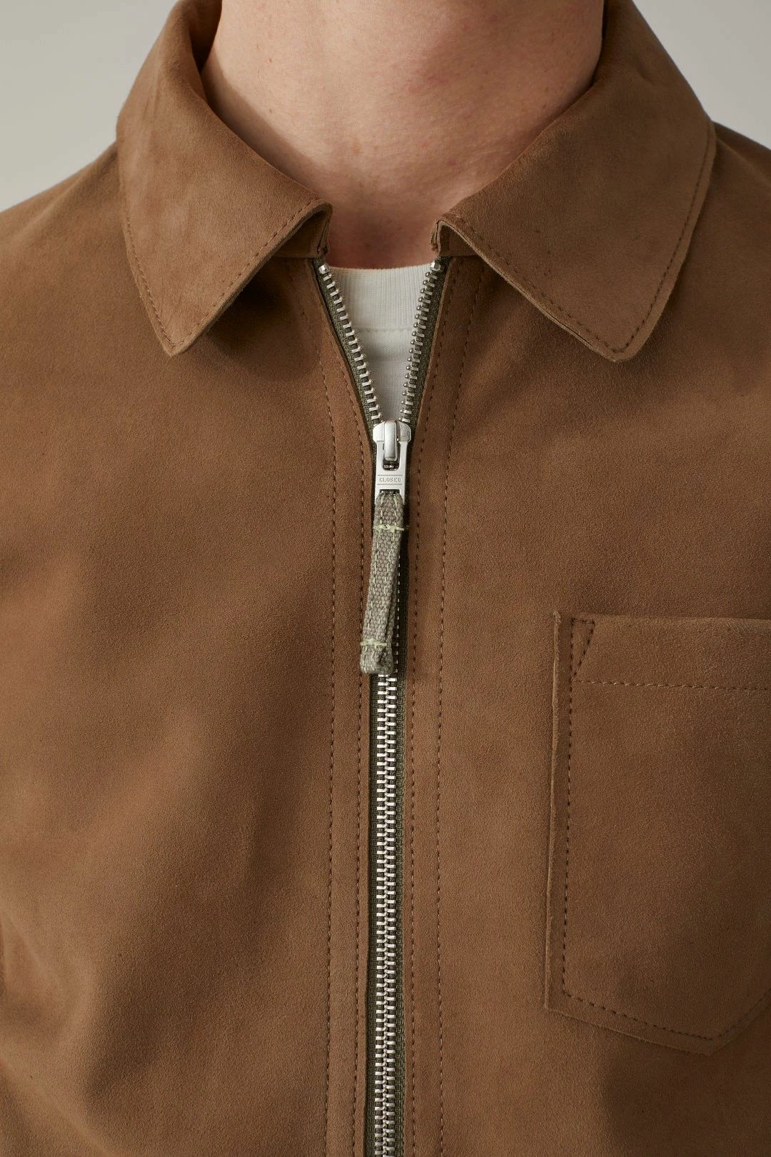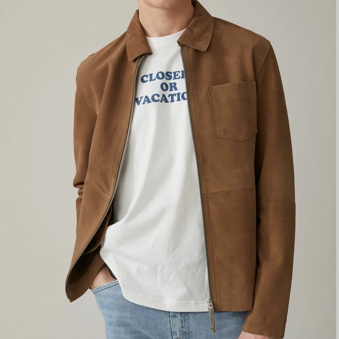 La magnifique veste légère en cuir d’agneau par Closed, avec côté extérieur en daim doux et souple, et côté intérieur en nappa (cuir pleine fleur d’excellente qualité, mince et doux).