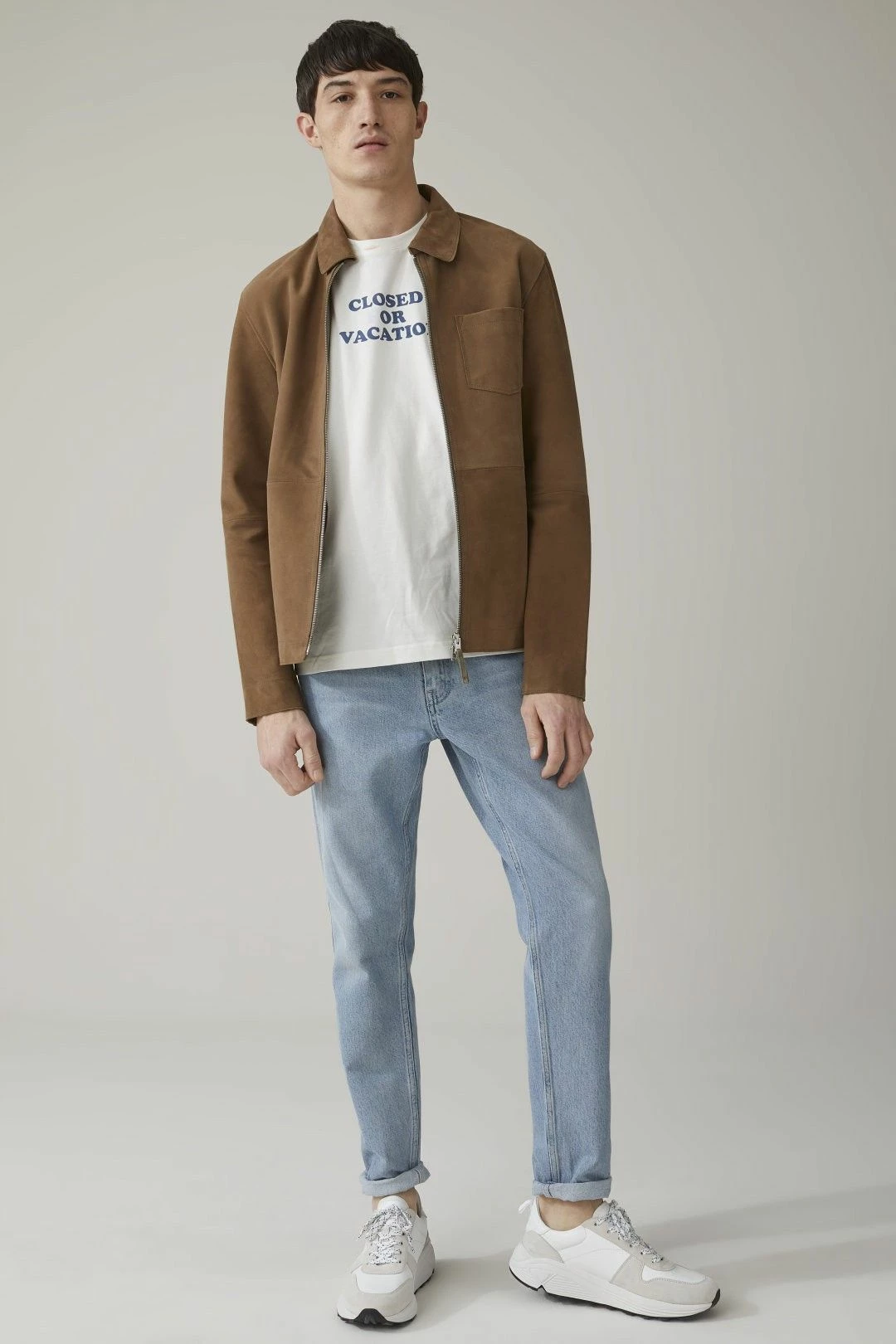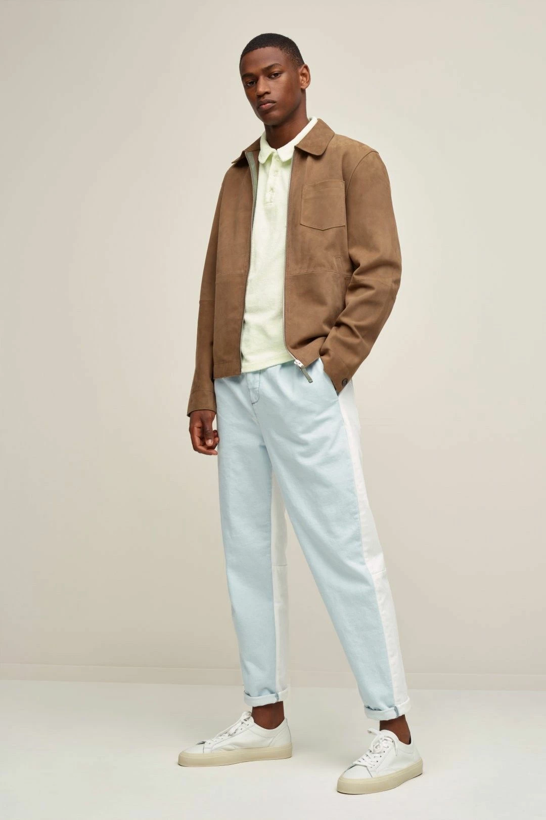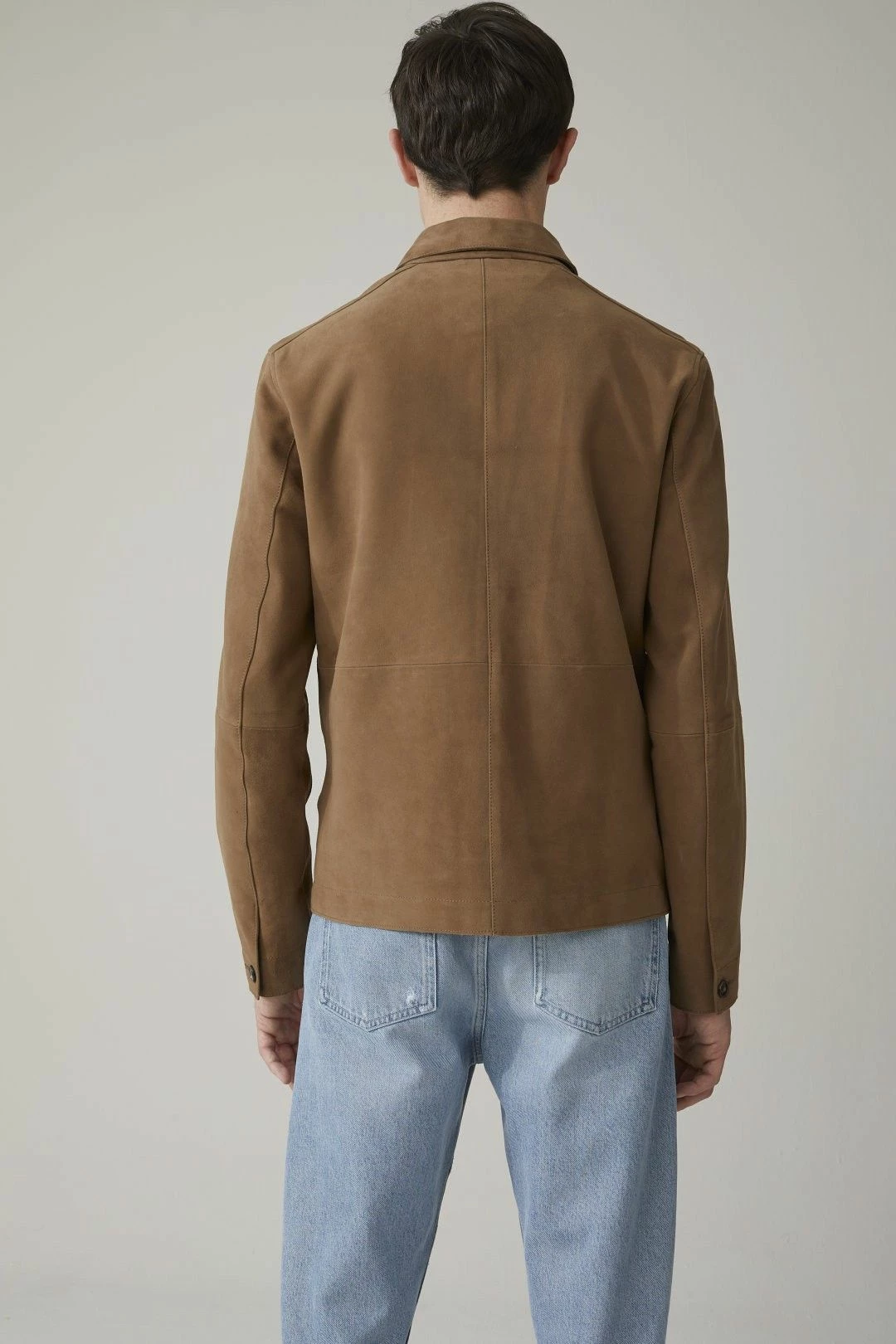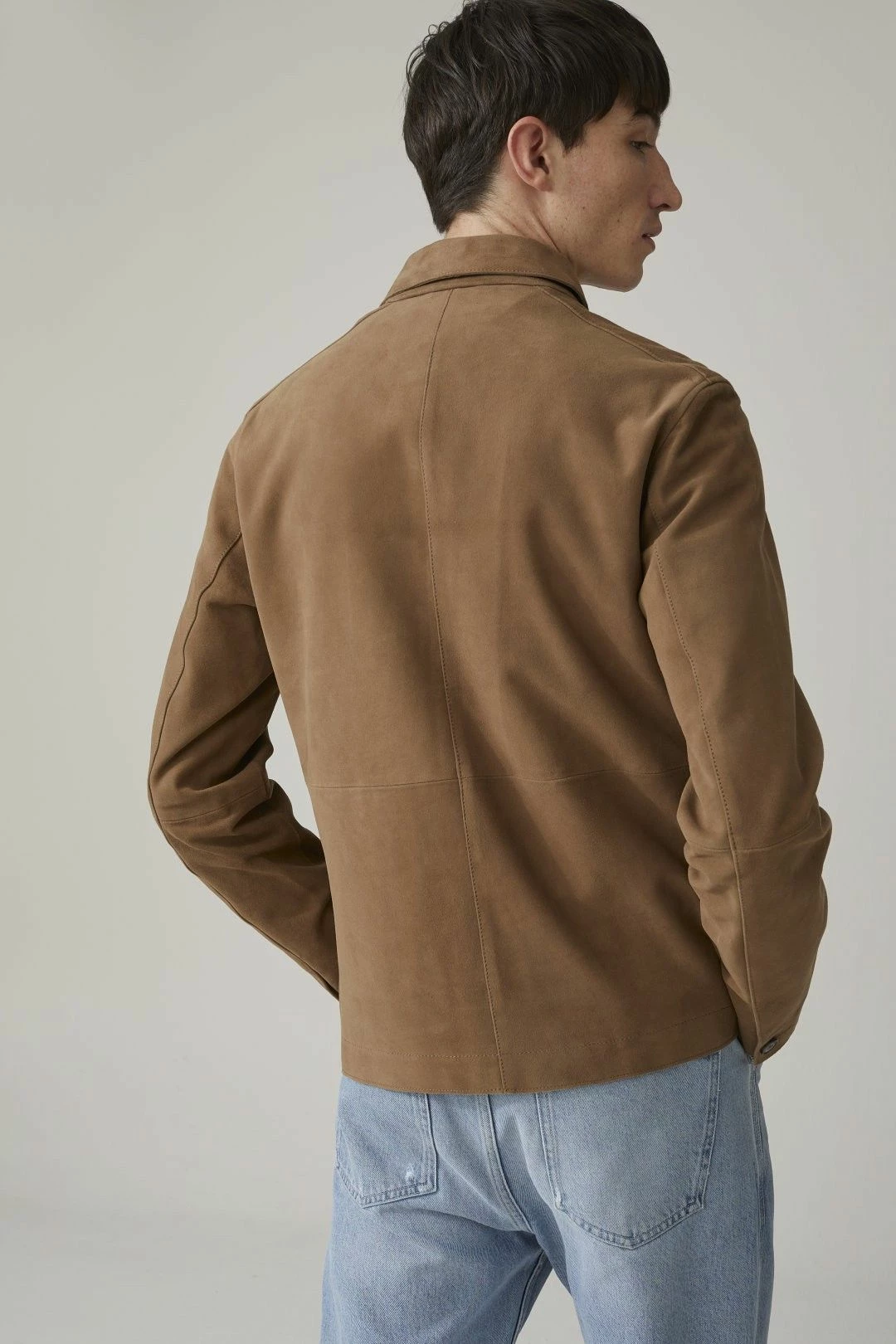 La magnifique veste légère en cuir d’agneau par Closed, avec côté extérieur en daim doux et souple, et côté intérieur en nappa (cuir pleine fleur d’excellente qualité, mince et doux).