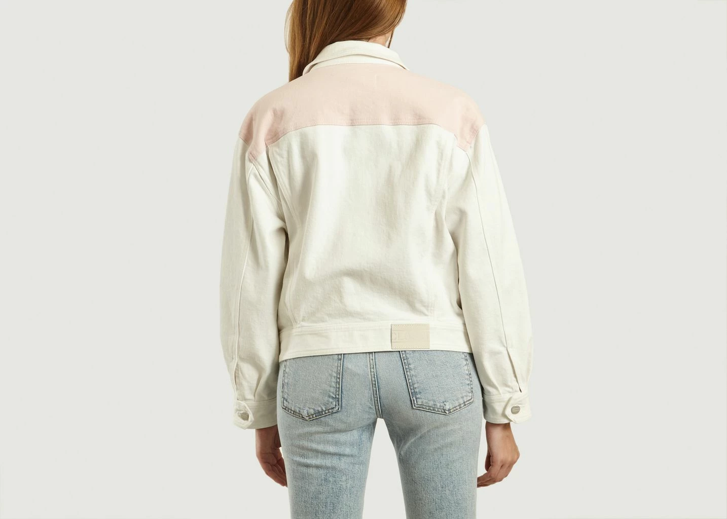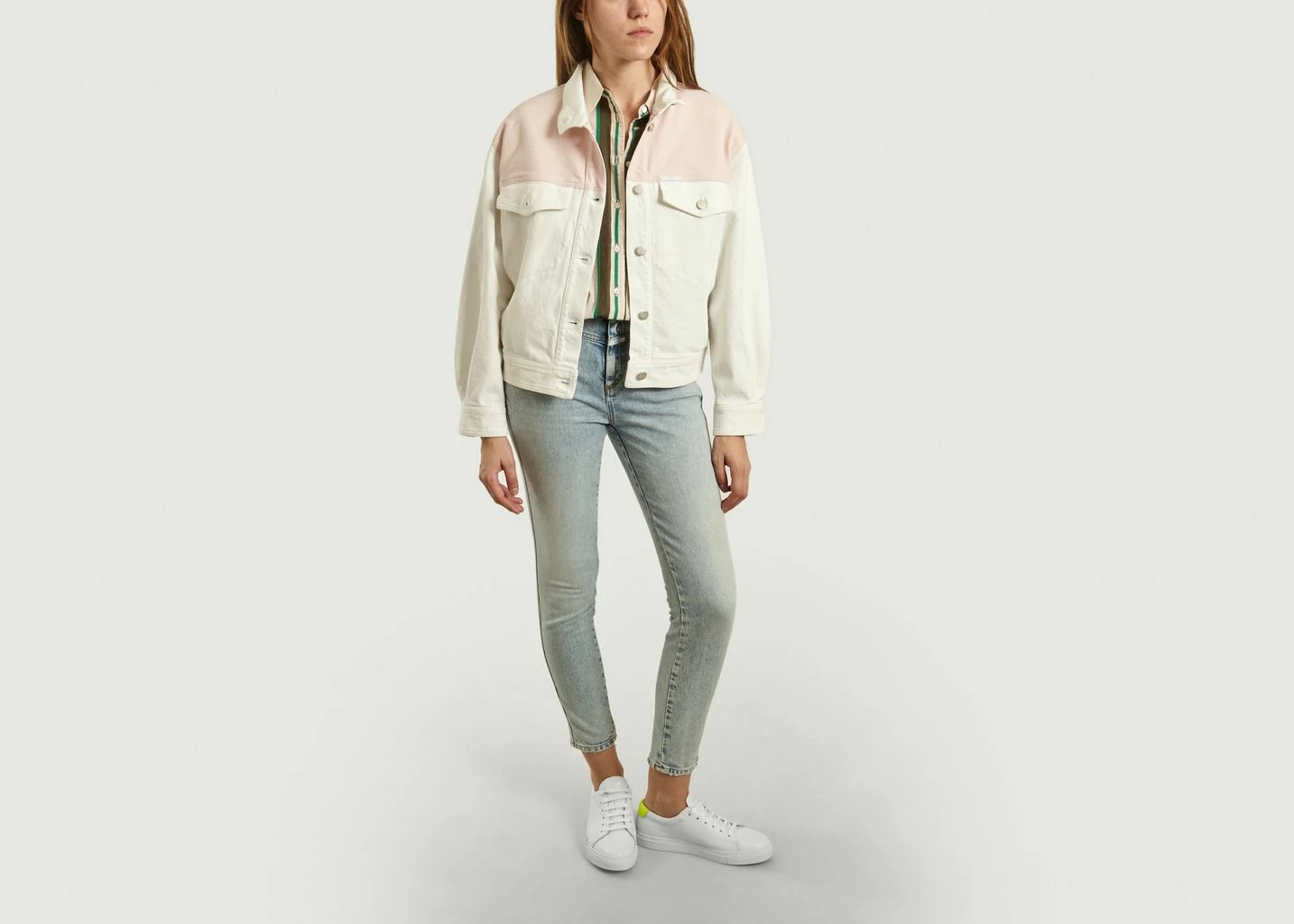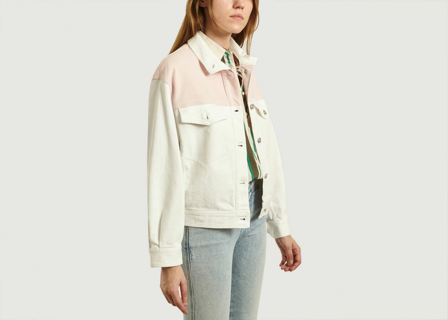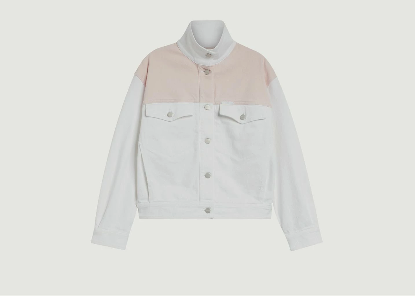 Denim patchwork jacket, white and pink, long sleeves, classic collar, buttoned closure, silver metallic buttons, two chest pockets, relaxed fit.