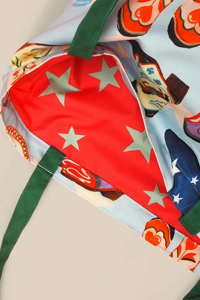 Transport your everyday essentials in style with this fabulous Cosmic Cowgirl Tote Bag from Eleanor Bowmer. It’s the perfect bag to use for everyday, work or holidays. Featuring hand painted cowboy boots on a pale blue background, green handles and contrasting red water resistant lining with blue stars. Eleanor has taken inspiration for this pattern from karaoke nights singing Dolly Parton and 70’s cowboy boots! Measurements: 50 x 50cm Materials: 100% cotton Iron inside out Wash at 30 degrees Made in Britain