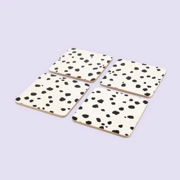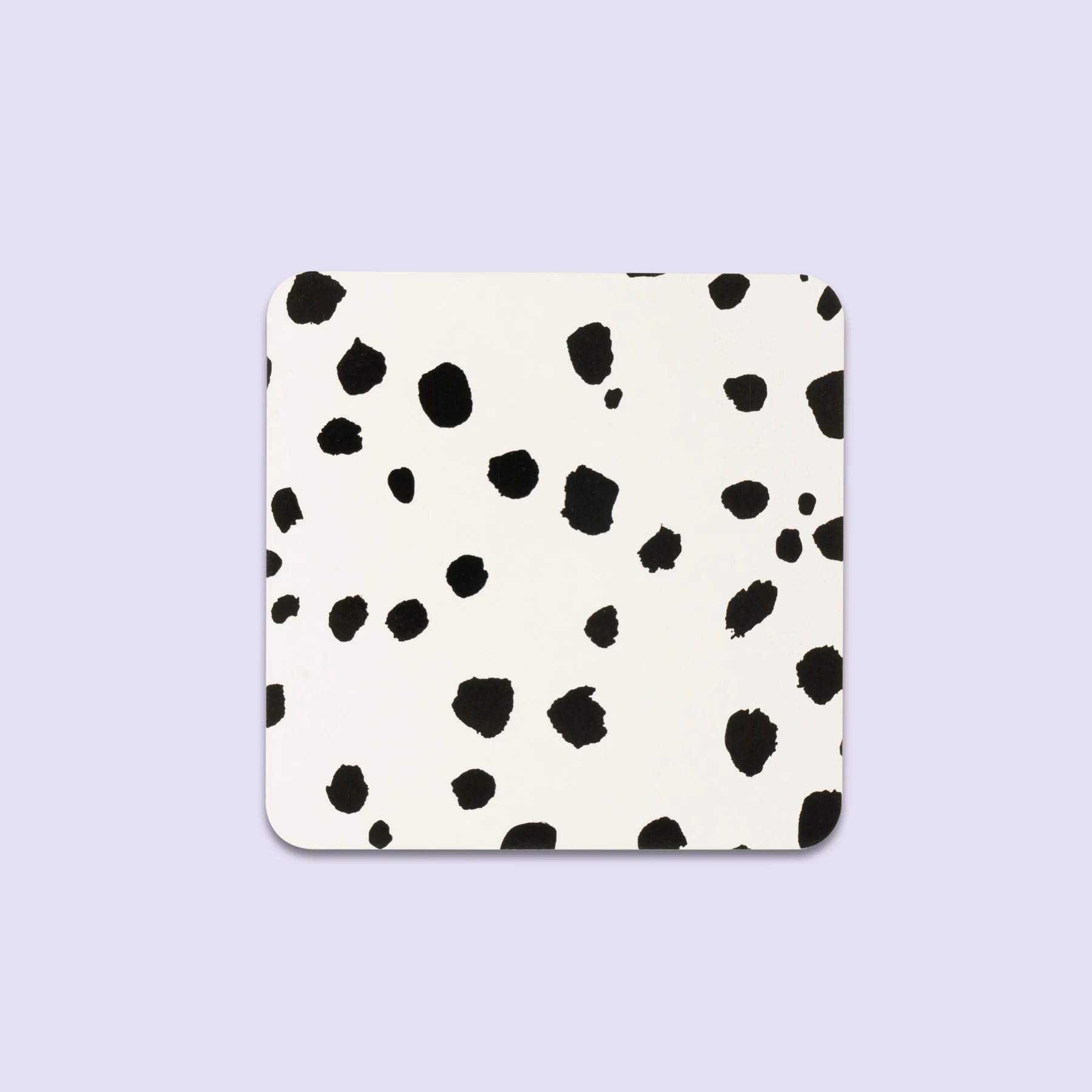 Protect your surfaces from hot and cold drinks with this set of four cork coasters! The soft cork backing will protect the table from marks while also looking super cute in our Dalmatian print!