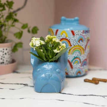 If you are a EB fan you might recognise the face of Frank, Eleanor’s dog on the front of this planter! The perfect addition to any windowsill to use as a plant pot or trinket dish. The planter is made of stoneware and painted in a glossy blue. Dimensions: Height 13.5cm Width 12cm Depth 11cm