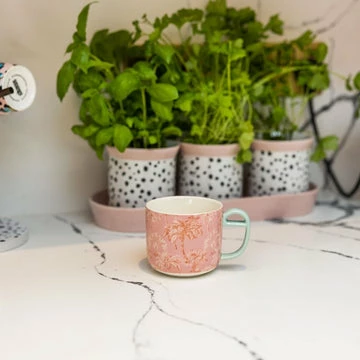 Eleanor Bowmer new range of short mugs feature an ‘e’ shaped handle for extra comfort when enjoying your brew. This short mug is printed with the Pink Sunset Palms pattern and made from fine China. The perfect gift for you or someone else to add some colour to your kitchen! All mugs are made from New Bone China and are of a premium quality. Dimensions: Height 8.5cm Width 12.5cm Dishwasher & Microwave safe.