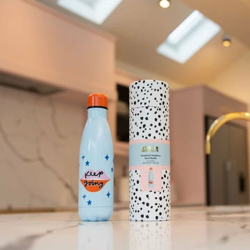 Eleanor Bowmer brand new range of water bottles come in all of our most iconic prints! The bottles are made of stainless steel with a high quality screw top lid to prevent leaks. This one features our Keep Going slogan design with a baby blue background! The ideal way to take a drink with you on your travels. Double walled stainless steel, can insulate both cold and hot water. Hand wash only. Dimensions: 26cm x 7cm Holds 500ml