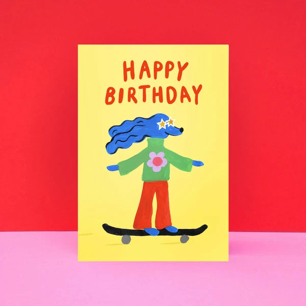 Our Funky Dog Birthday card features an adorable hippy style dog riding a skateboard with Happy Birthday written in red. Comes with a pale blue envelope. *All cards are left blank inside for your own message Printed and packed in the UK in compostable packaging. Our beautiful cards are made from premium stock with a luxurious silk texture and gold foil printed. Size: 105 x 150 mm
