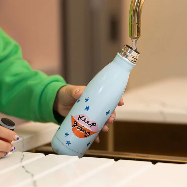 Our brand new range of water bottles come in all of our most iconic prints! The bottles are made of stainless steel with a high quality screw top lid to prevent leaks. This one features our Keep Going slogan design with a baby blue background! The ideal way to take a drink with you on your travels. All bottles are delivered in a cylindrical gift style box. Double walled stainless steel, can insulate both cold and hot water. Hand wash only. Dimensions: 26cm x 7cm Holds 500ml