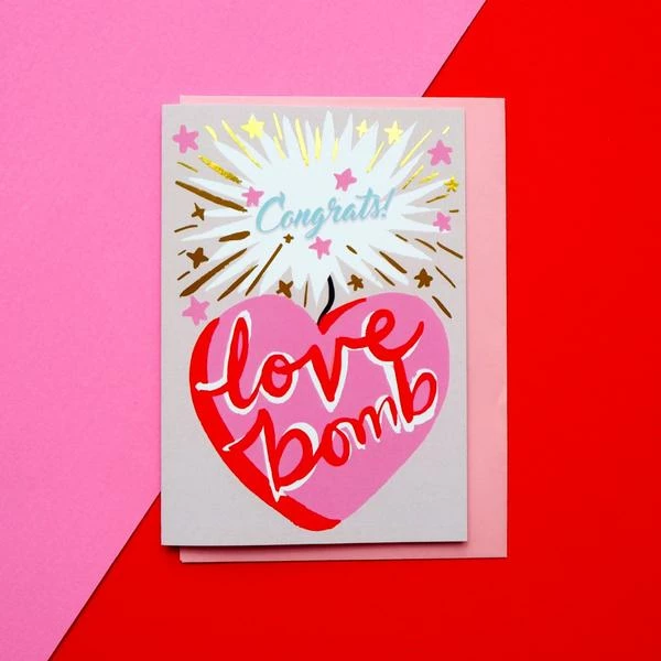 Greetings card designed by Eleanor Bowmer featuring a heart shaped love bomb with gold foil detail. This card has been left blank inside ready for your own message. Card measures 10.5 x 15 cm and comes with a pale pink envelope. Printed in the UK.