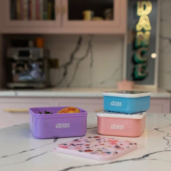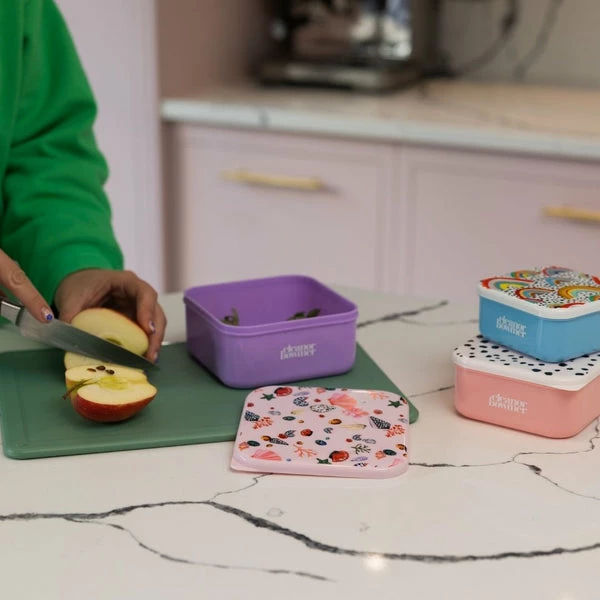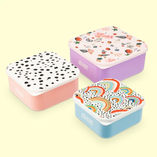 Introducing our new kitchen and cookware range! This set of 3 printed pots are stackable and easy to clean. They feature 3 of our most iconic prints, ‘Miami Shells’, Dalmatian Dot’ and ‘Rainbow’. The perfect container for your snacks and office lunches. Match the snack pots with more items from our new range, including travel mugs. This product is made of plastic and is dishwasher safe. Dimensions: Large – 16.5cm x 16.5cm Height – 6.3cm Medium – 11.8cm x 11.8cm Height – 5.5cm Small – 10.3cm x 10.3cm Height – 5.5cm