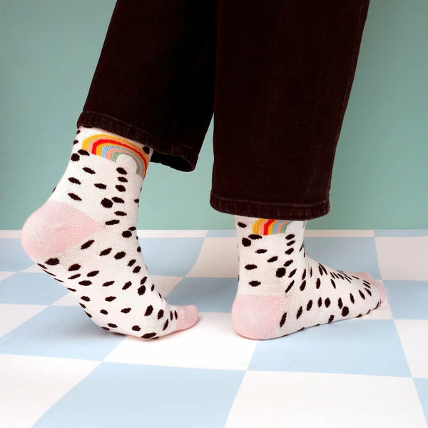 Our Women’s ‘Rainbow’ Socks feature our Rainbow Spot design on a white sock with a pink heel, toe and cuff. We worked very hard to make the quality super soft, hardwearing and breathable to keep your feet happy all day long. This design will make the perfect gift for a friend, Mum, leopard lover, sister and of course yourself. Each pair of socks comes packaged in a colourful branded sock wrap that holds product information and care instructions. Our socks can all be worn as unisex but have been made to fit the following sizes. Women’s Socks are UK size 4-7. Men’s Socks are UK size 7-11. Designed in Britain. Manufactured in Turkey. 74% Cotton, 23% Polyamide, 3% Elastane. Wash with similar colours on a 40°C wash cycle.