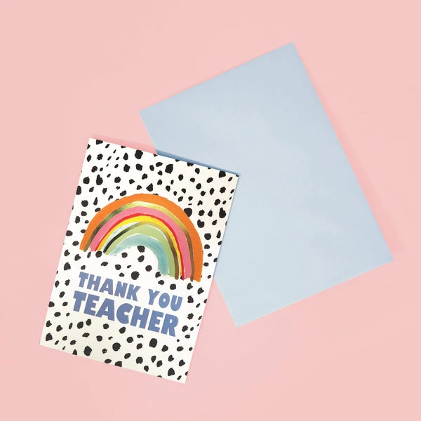This cute card features a Dalmatian dot background with a pastel rainbow design and reads ‘Thank You Teacher’. The perfect card to for your son or daughter to send to their fave teacher! Comes with a blue envelope. *All cards are left blank inside for your own message Size: 105 x 150 mm Printed and packed in the UK. All cards are packed in compostable wrap made of potato starch.